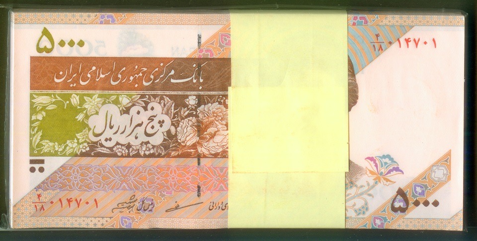مطابق تصویر، بسته 1-100 اسکناس 5000 ریالی گل و بلبل امضای مظاهری شیبانی