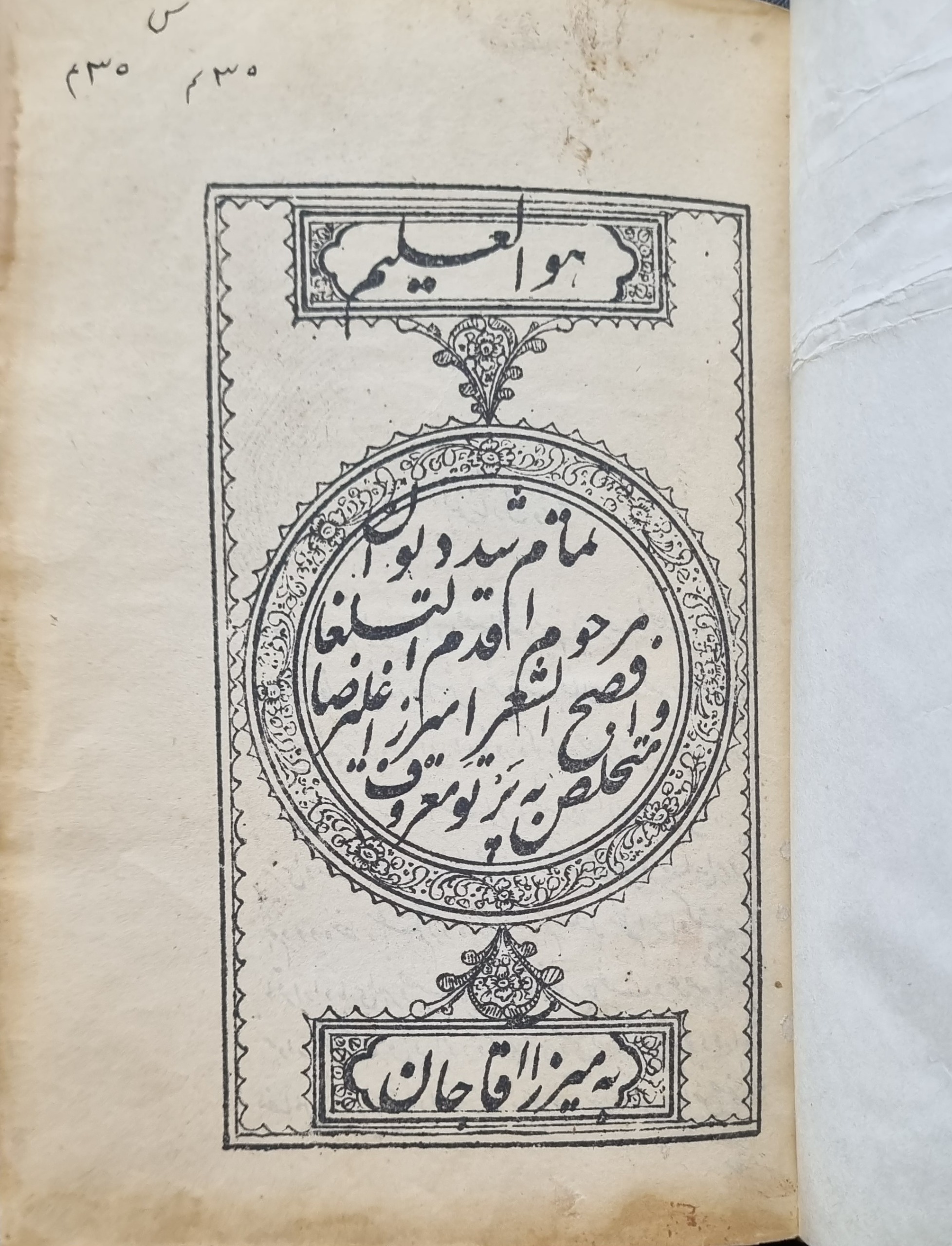 چاپ شده در مطبعه خاص همایونی دیوان میرزا علیرضا متخلص به پرتو معروف به آقا جان