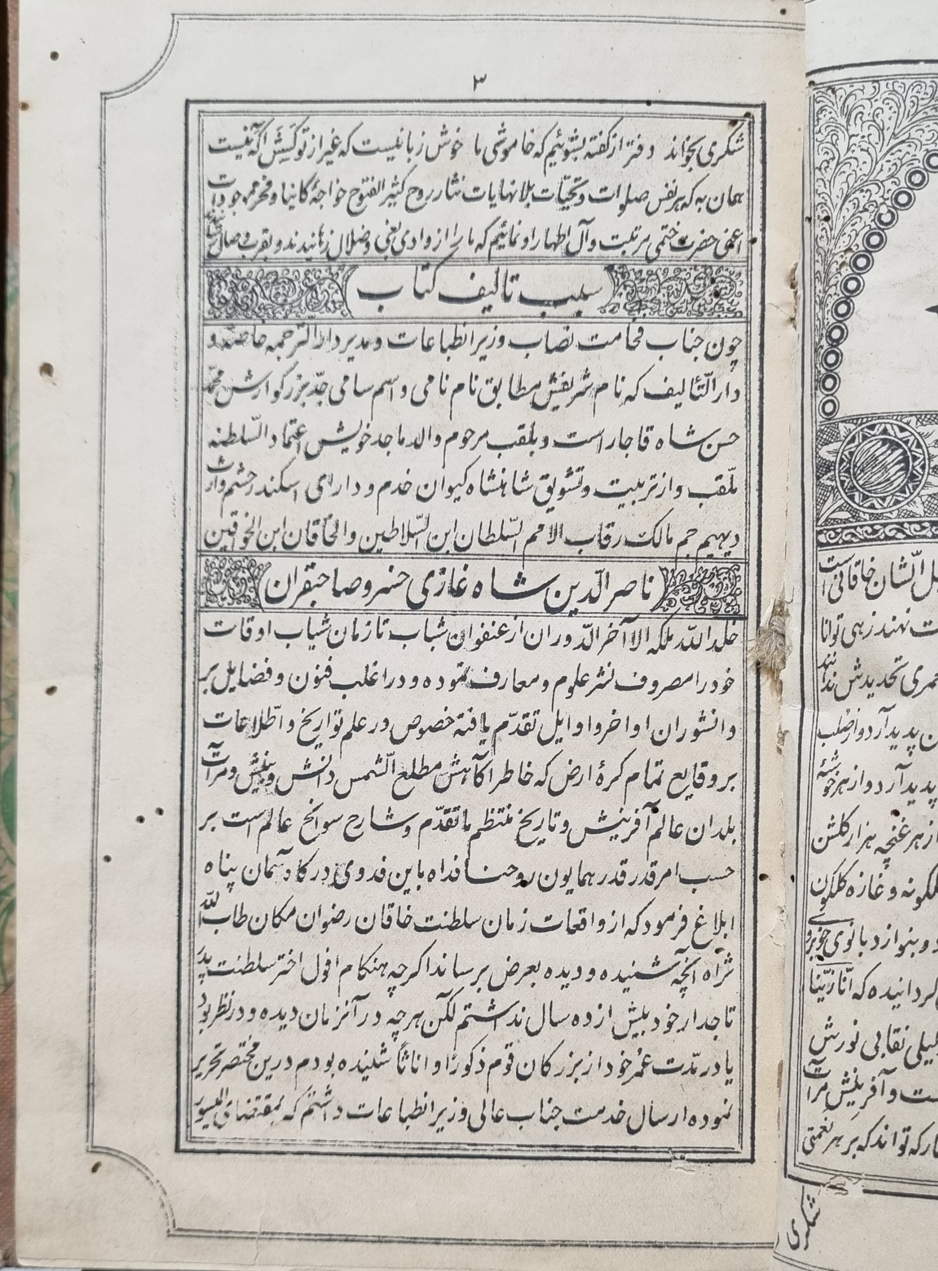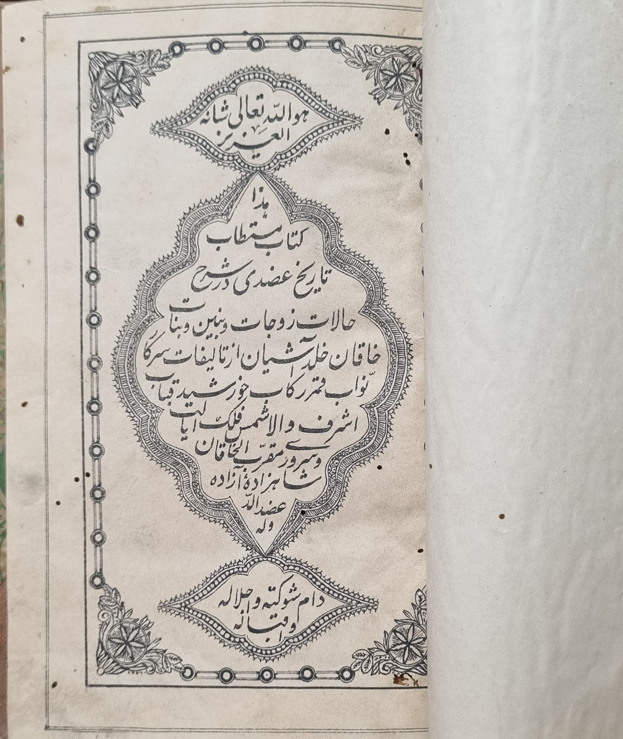 کتاب مستطاب تاریخ عضدی در شرح حالات زوجات و بنین و بنات خاقان خلد آشیان از تألیفات سرکار نواب قمر رکاب خورشید قباب اشرف والا شمس فلک ایالت و سروری مقرب الخاقان شاهزاده آزاده عضدالدوله
