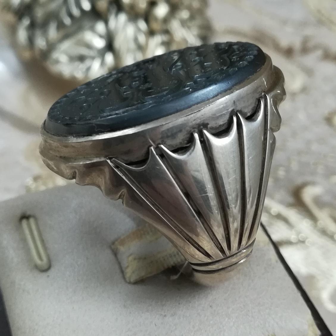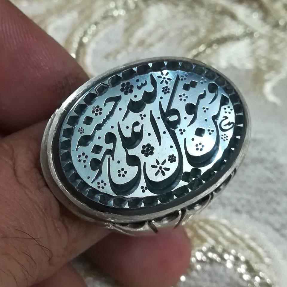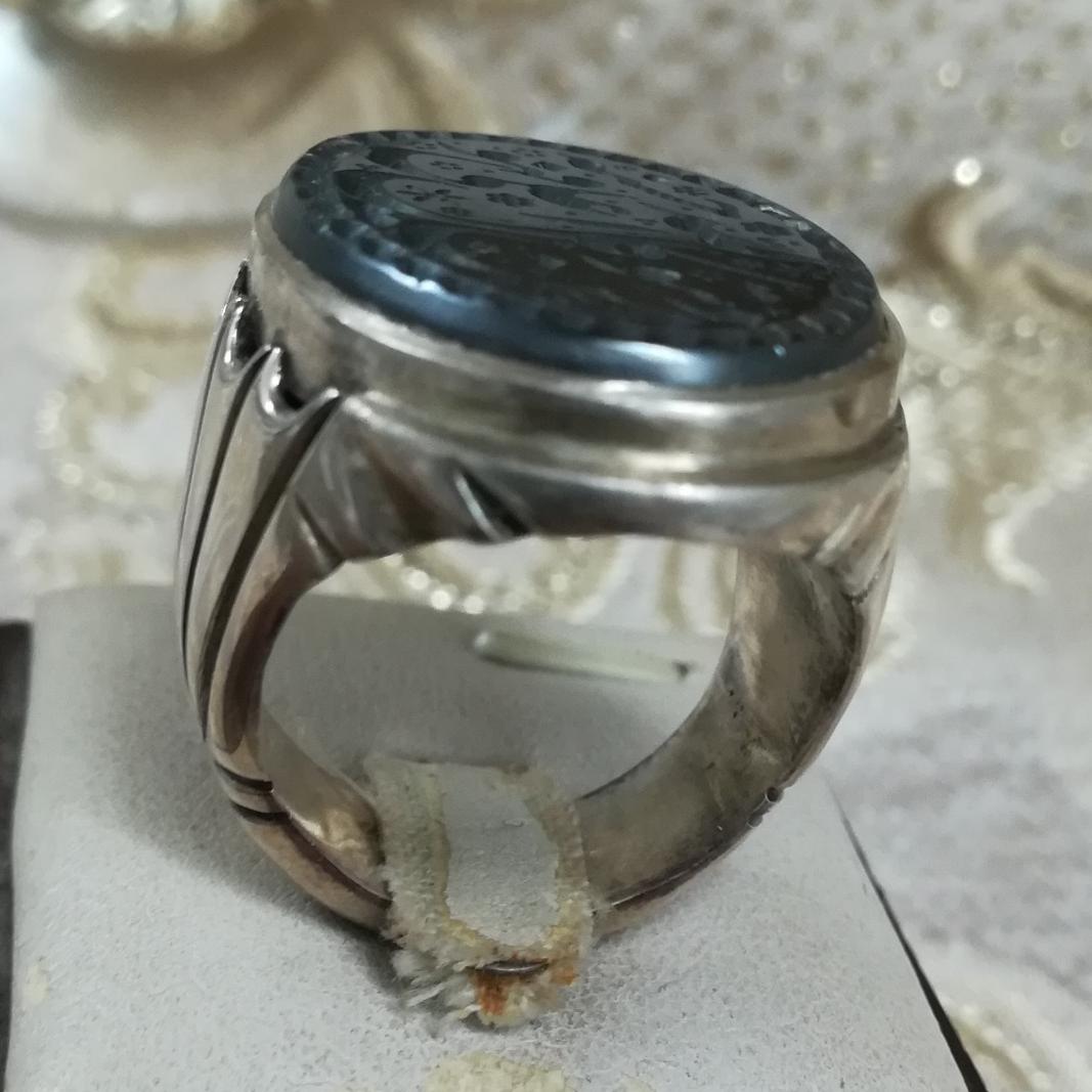 انگشتری فاخر و بینظیر هم از لحاظ نگین حدید صینی اصیل معدنی مزین به خط هنر دست استاد حمد با امضای ایشان زیر خط و رکاب دستساز لوکس مدل شیرازی از جنس نقره خارجی اعلا عیار 925 ساخت هنر دست استاد معروف جناب استاد (گودرزی)