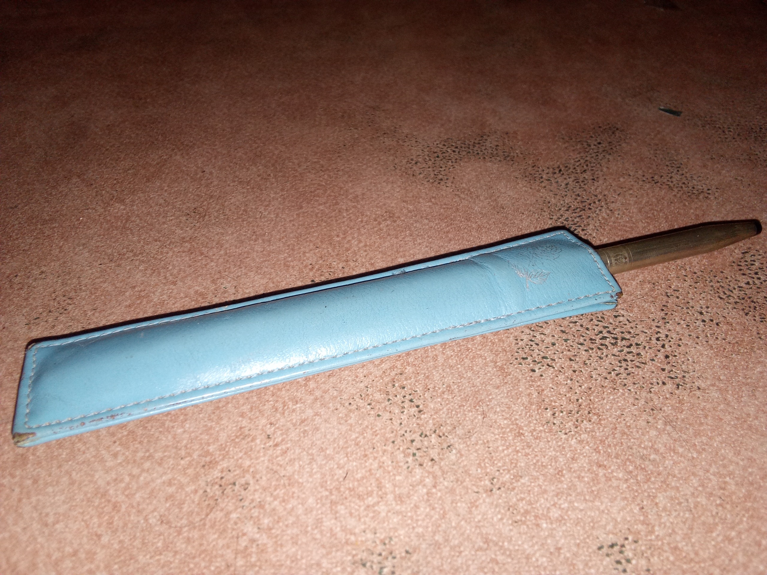 یک خودکار پیچی طرح صلیب قدیمی سایز 1/20 با روکش طلای 14 عیار و کیف چرم گاو