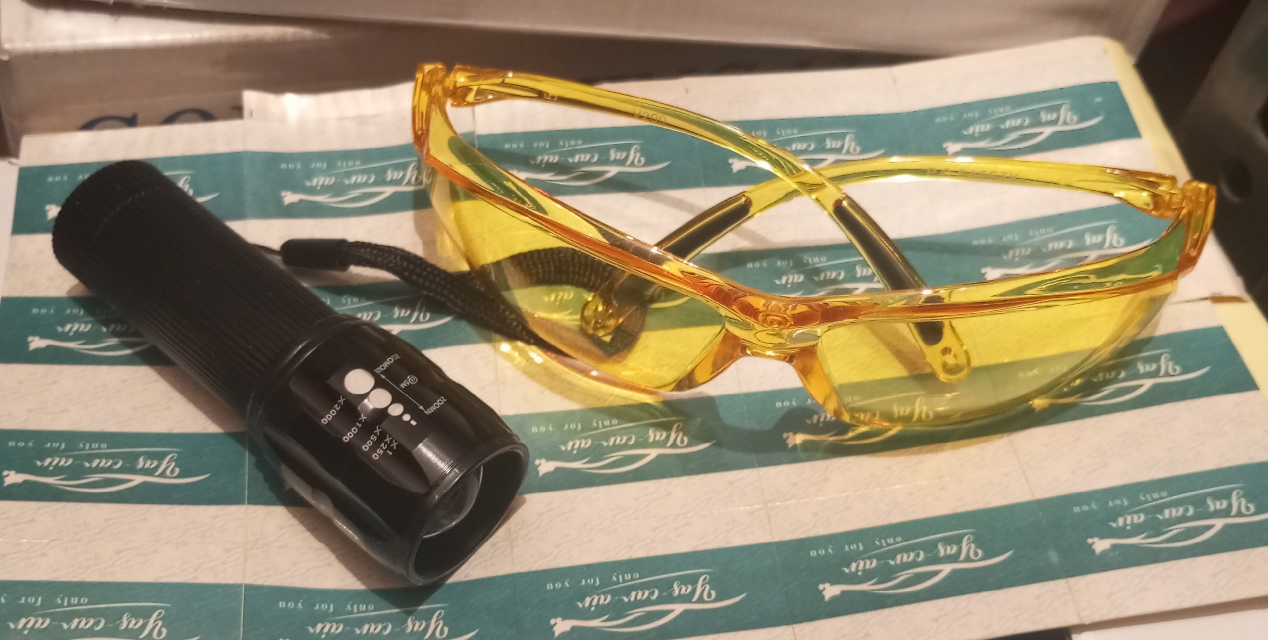 چراغ قوه و عینک نشت یابی (با سرنگ مایع فسفری)