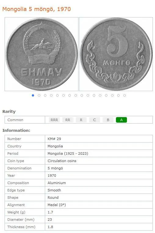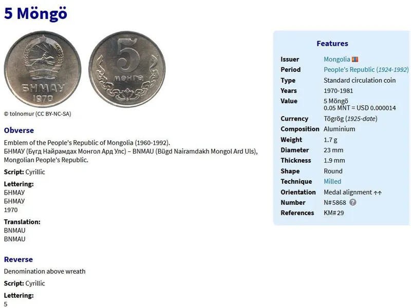 سکه 5 مونگو مغولستان 1970 (نایاب)
