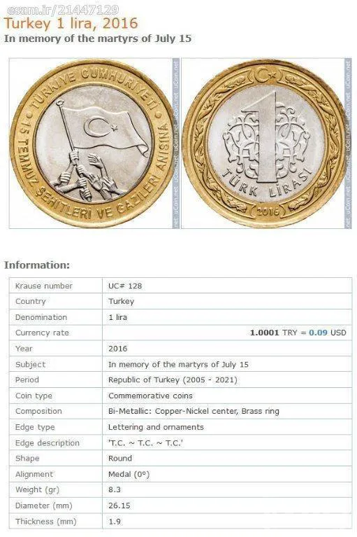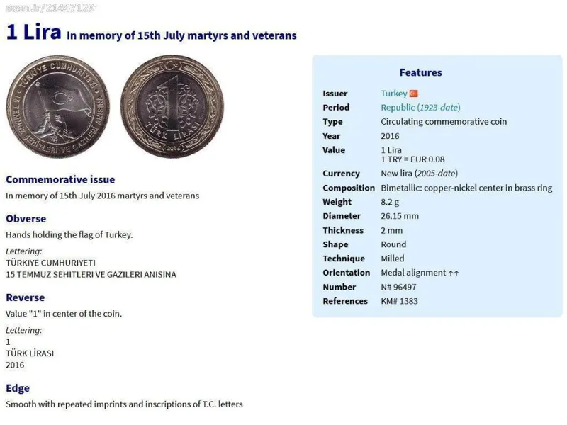 سکه یادبودی 1 لیره ترکیه 2016 (2)