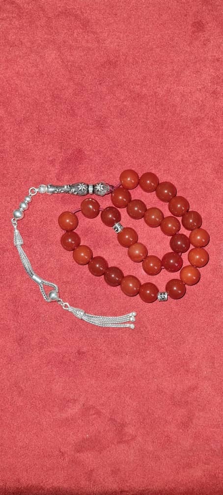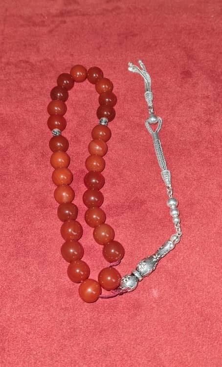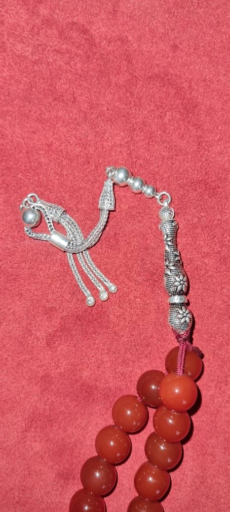 تسبیح 27 دانه عقیق با شیخک و سرتسبیح و واشر های نقره 925 ترک