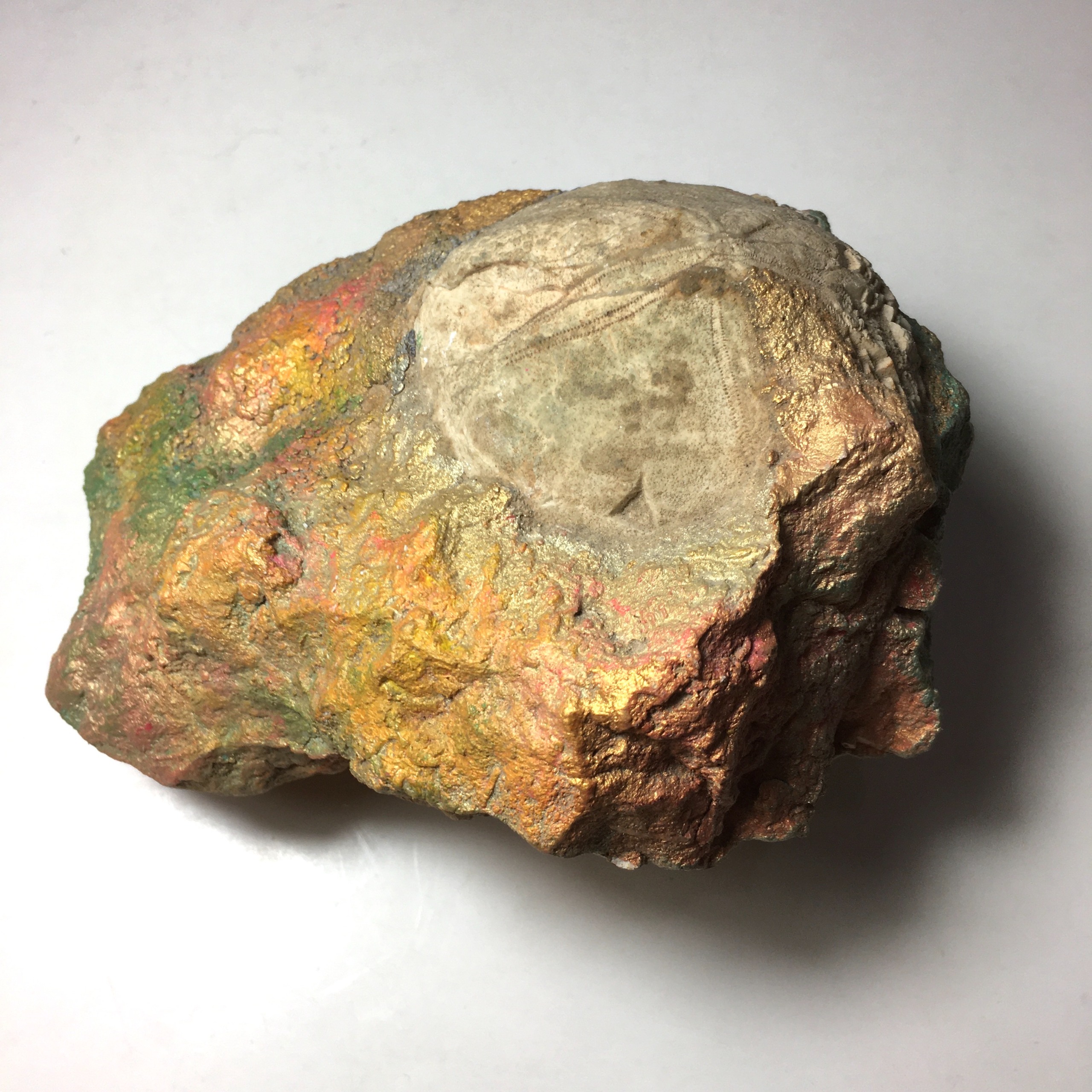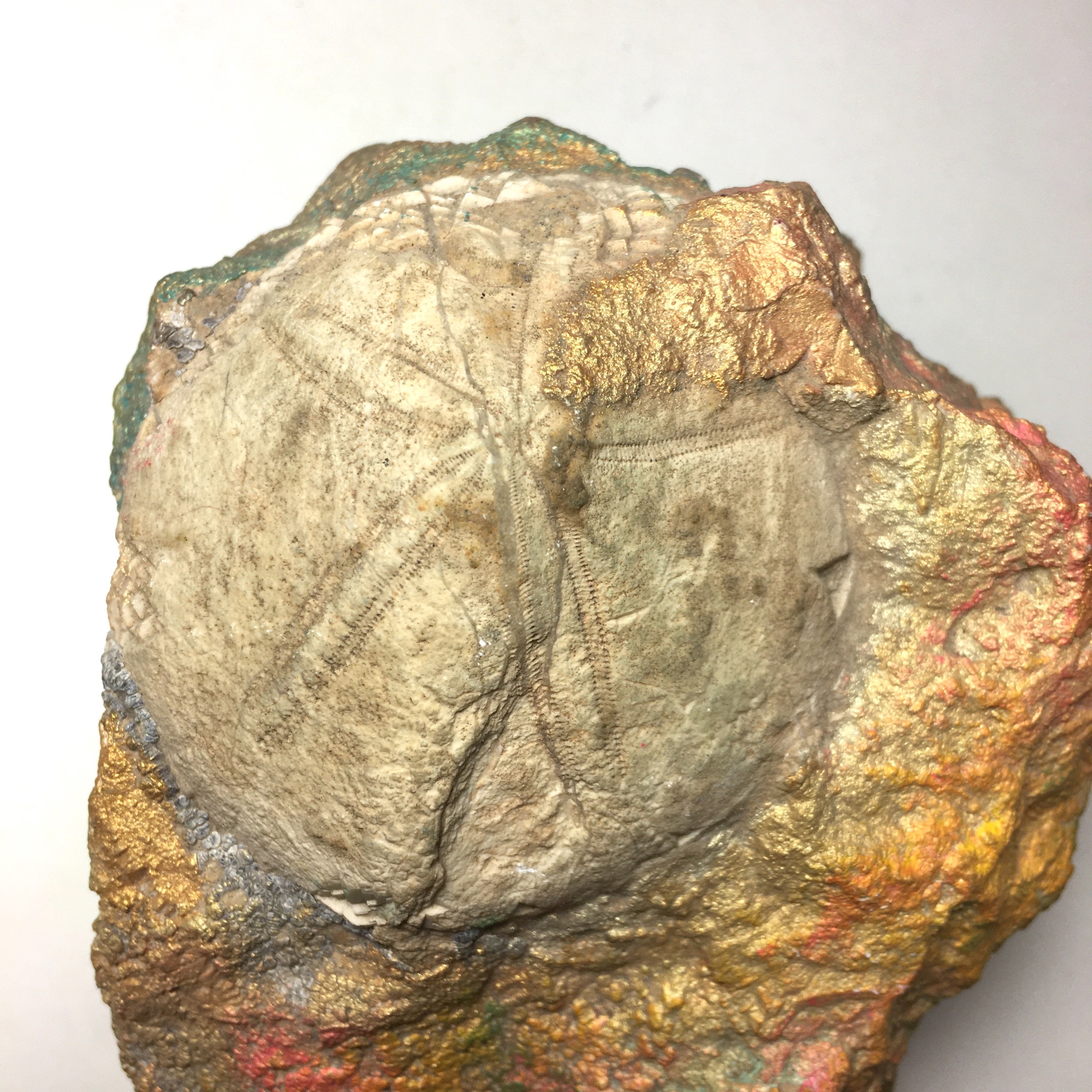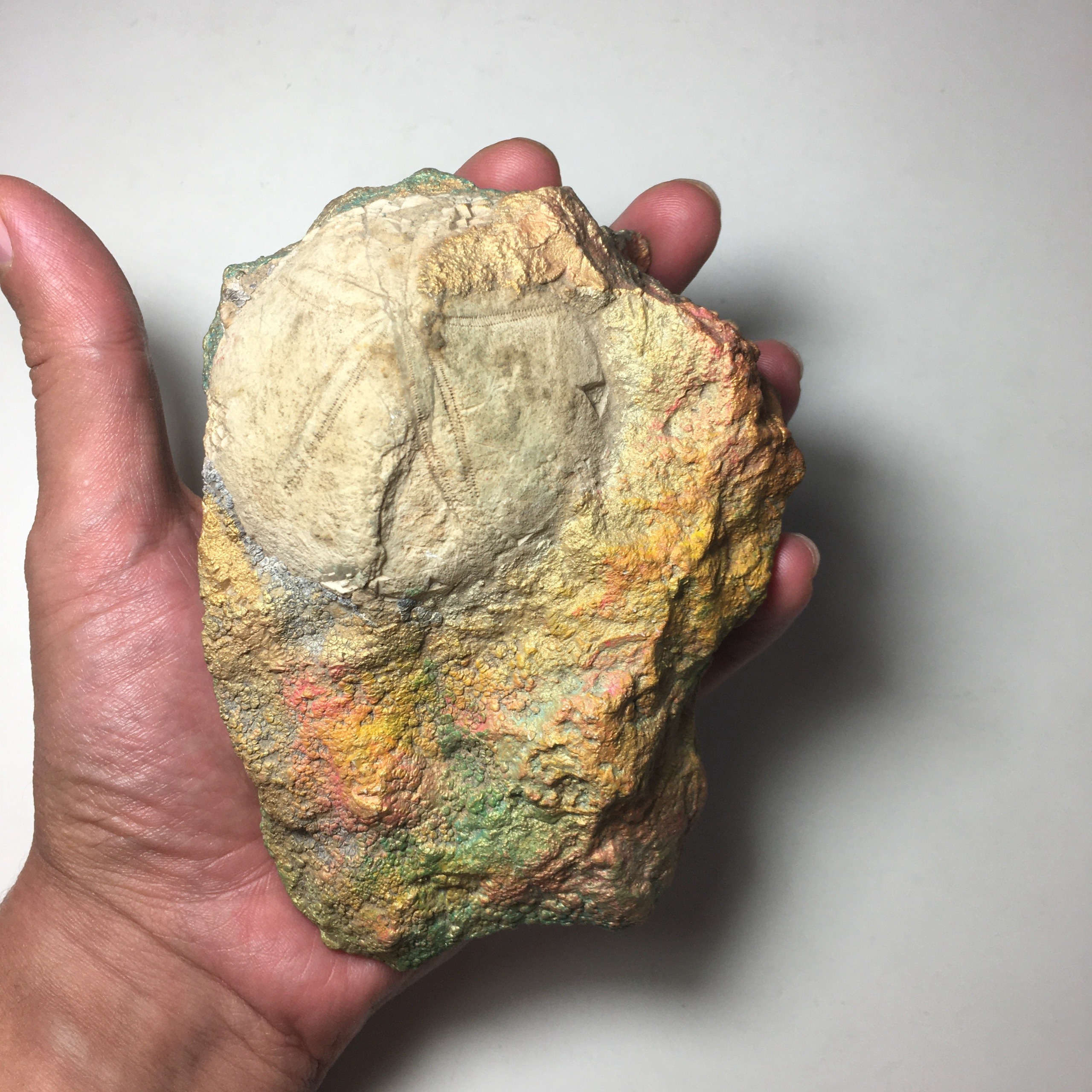 یک فسیل کمیاب و زیبا از توتیای دریایی (Sea Urchin) با ظاهری طبیعی و رنگ آمیزی هنری آکریلیک، مناسب برای کلکسیون داران، دوست داران طبیعت و دکورهای خاص.