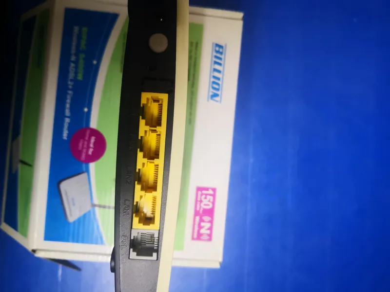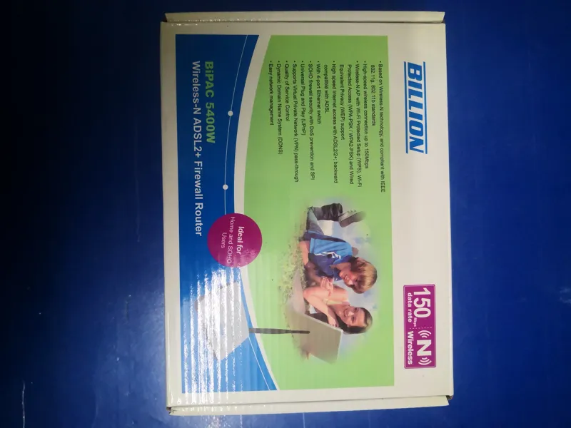 مودم وایرلس BILLION مدل 5400w این مودم کاملا سالم دارای یک پورت RJ11 تلفن و 4 پورت LAN اترنت RJ45 و یک آنتن خارجی دارای دکمه روشن و خاموش وای فای در پشت دستگاه و دکمه پاور و سوراخ ریست دستگاه در زیر دستگاه این دستگاه همراه جعبه و اداپتور ارسال میشود ورود به صفحه تنظیمات مودم به آدرس 192.168.1.254می باشد