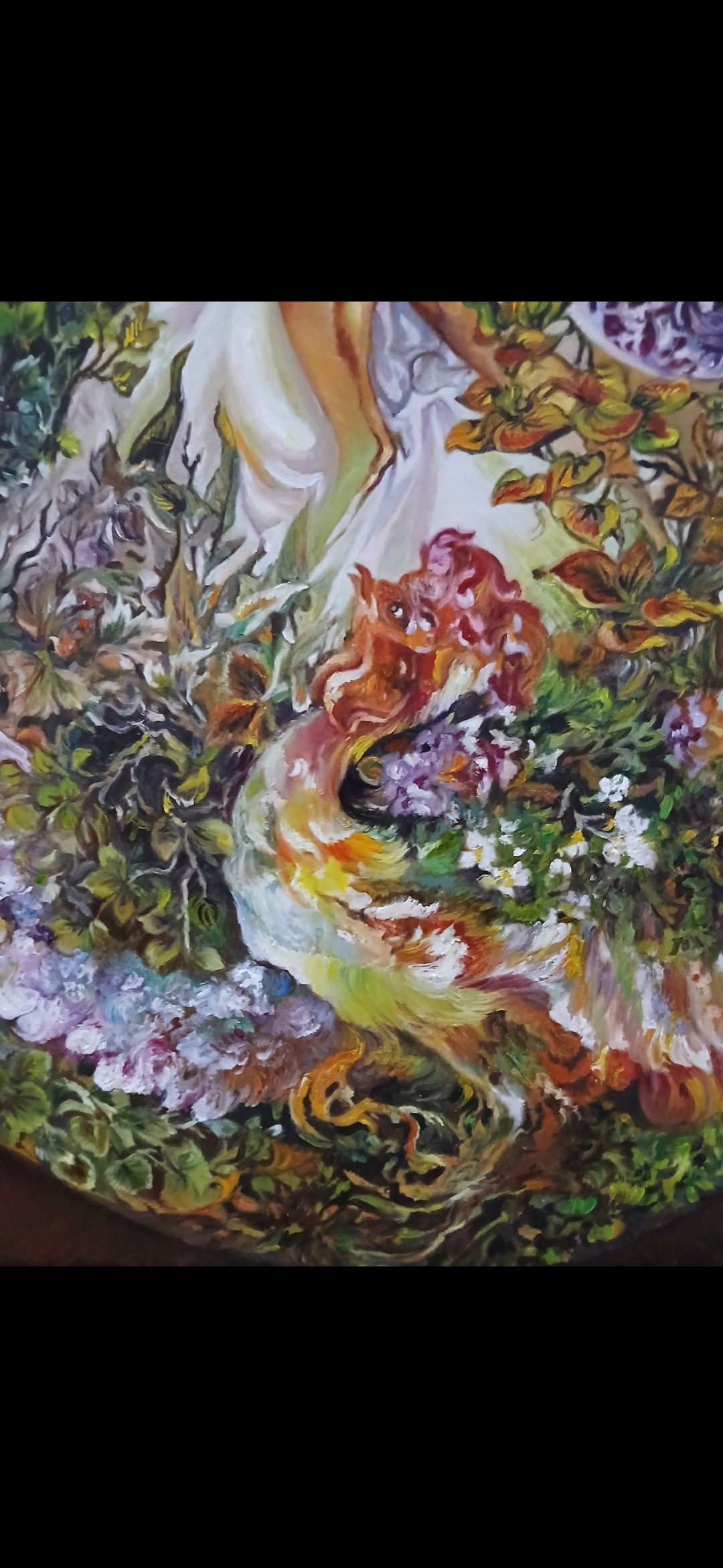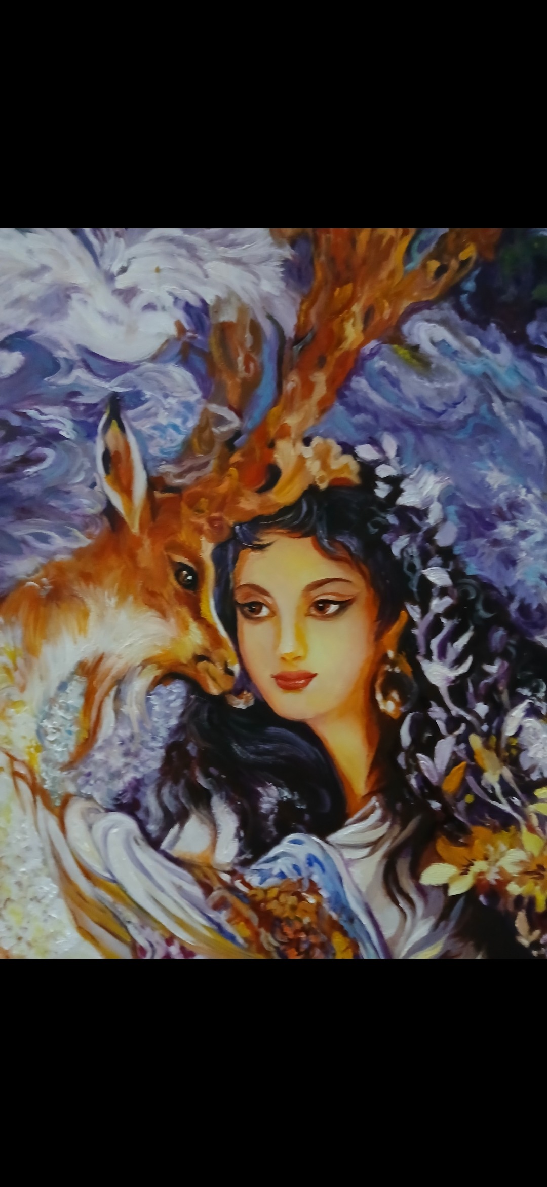 بانوی مو مشکی با گوزن + سیمرغ رنگارنگ