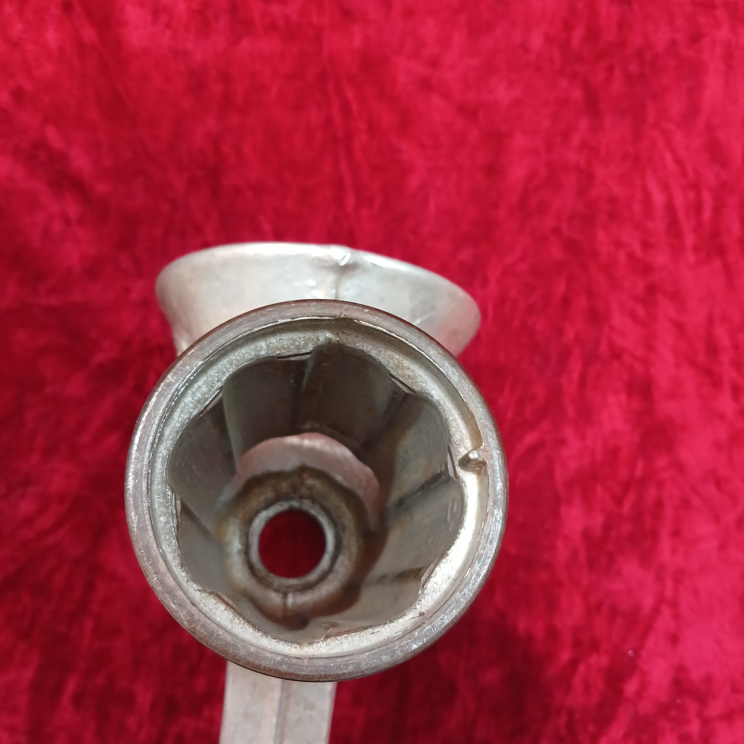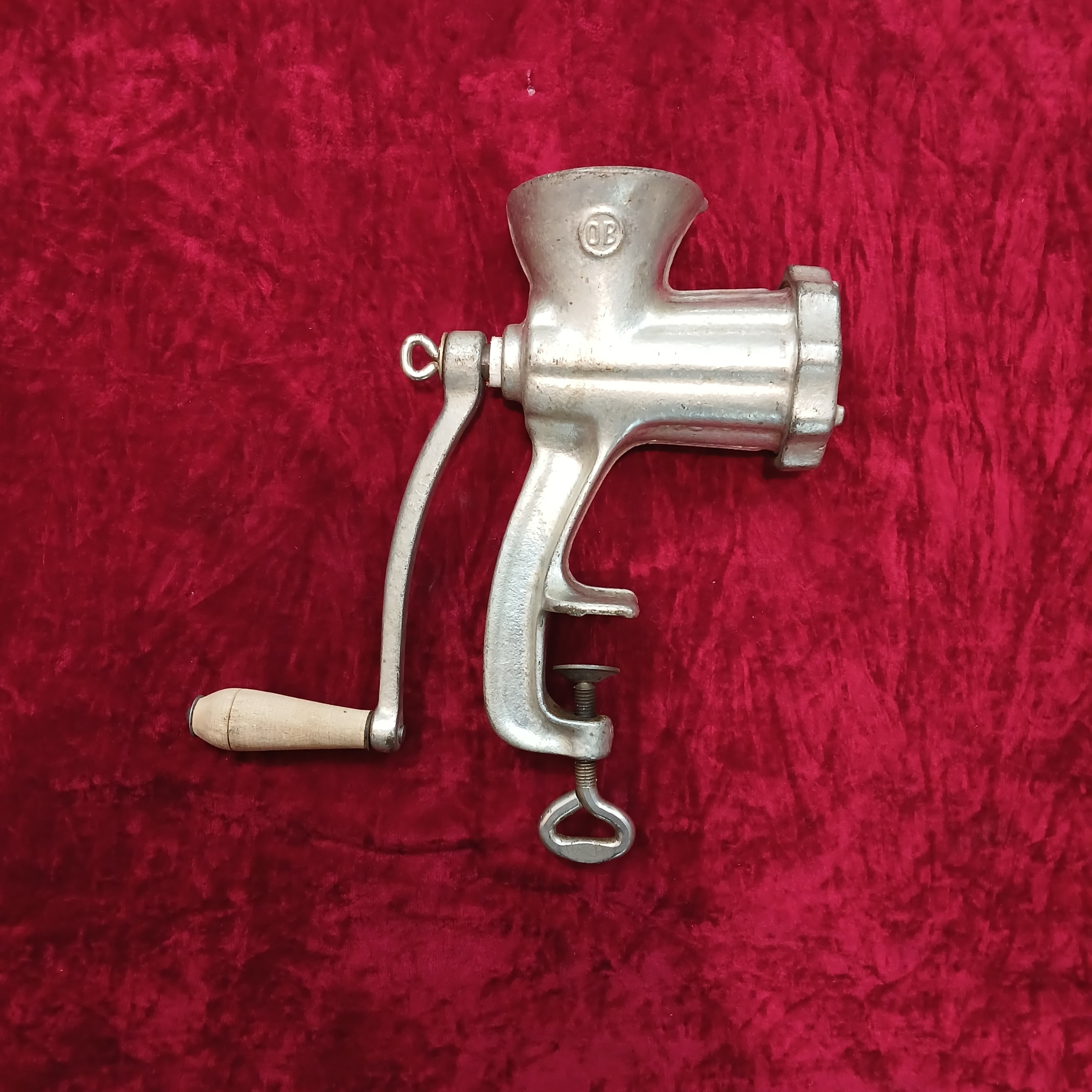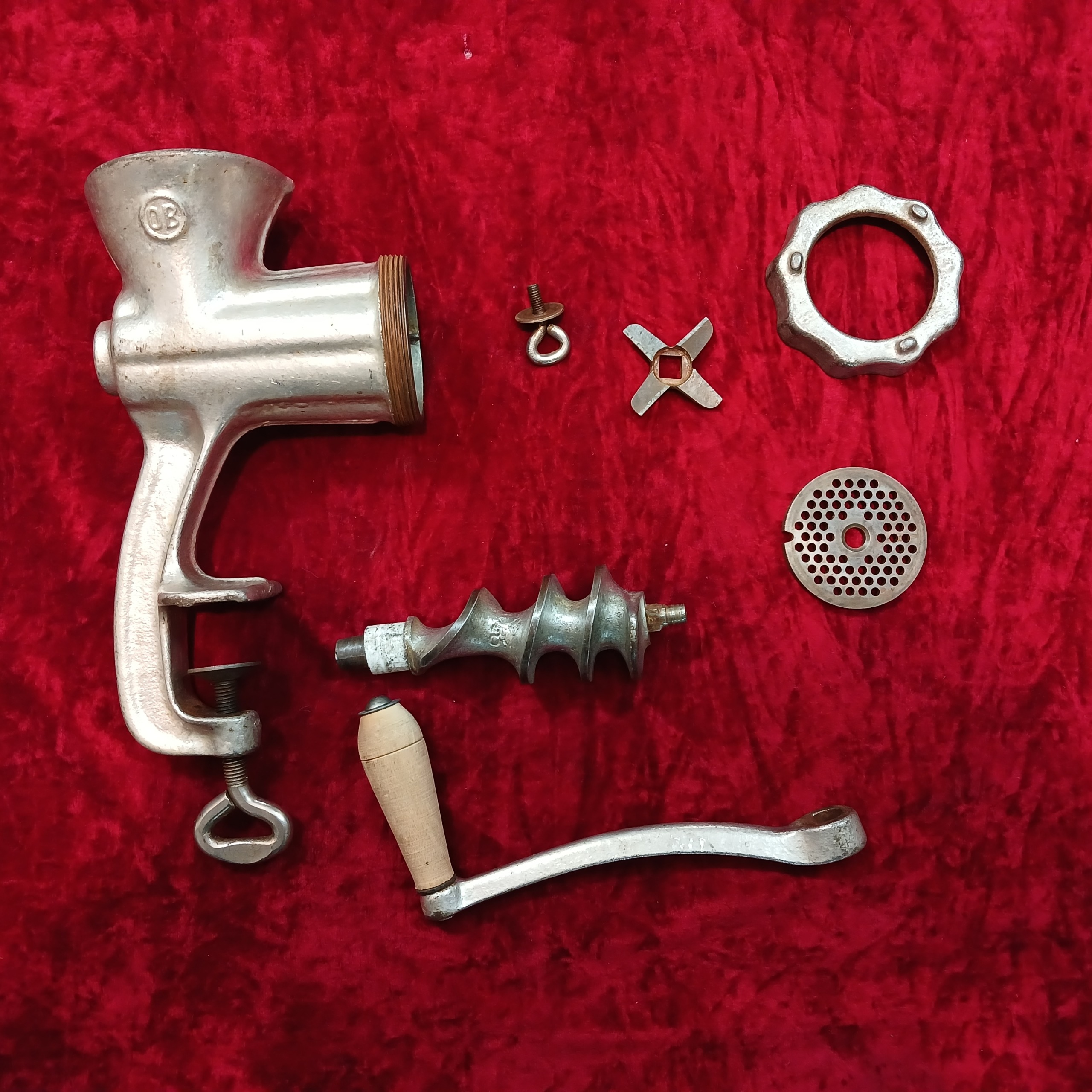 یک دستگاه چرخ گوشت دستی فلزی آهنی قدیمی مال زمان پهلوی سالم و بدون ایراد قابل استفاده خیلی تمیز و مرتب مونده شماره 8 ساخت شرکت الفا و تولید کشور خارجی.