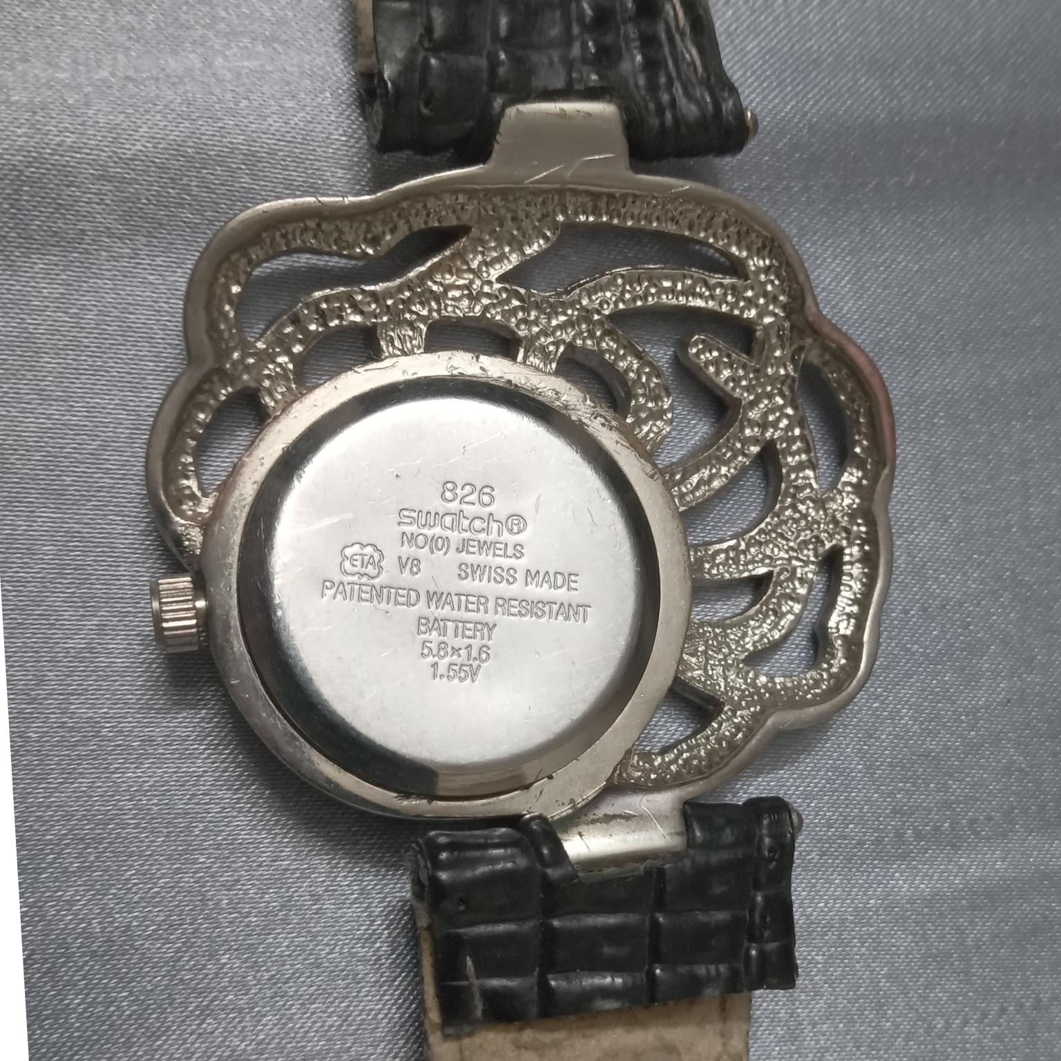 - ترکیب اصالت و کیفیت: روی پشت قاب، عبارتهایی چون "SWISS MADE" و "SWATCH®" (طرح برند) به همراه مشخصات فنی حک شده که بر الهامگیری از کیفیت سوئیسی تأکید دارد.