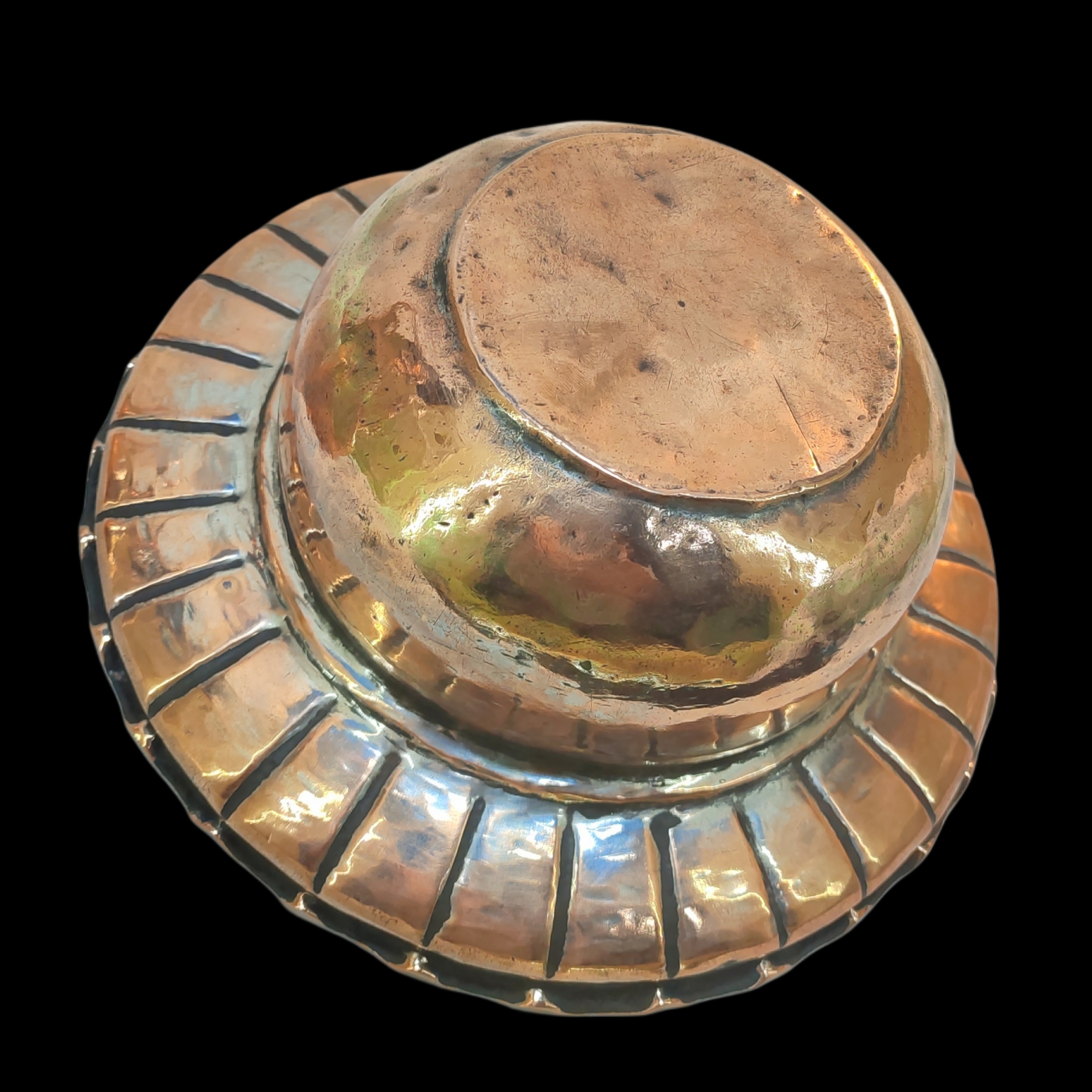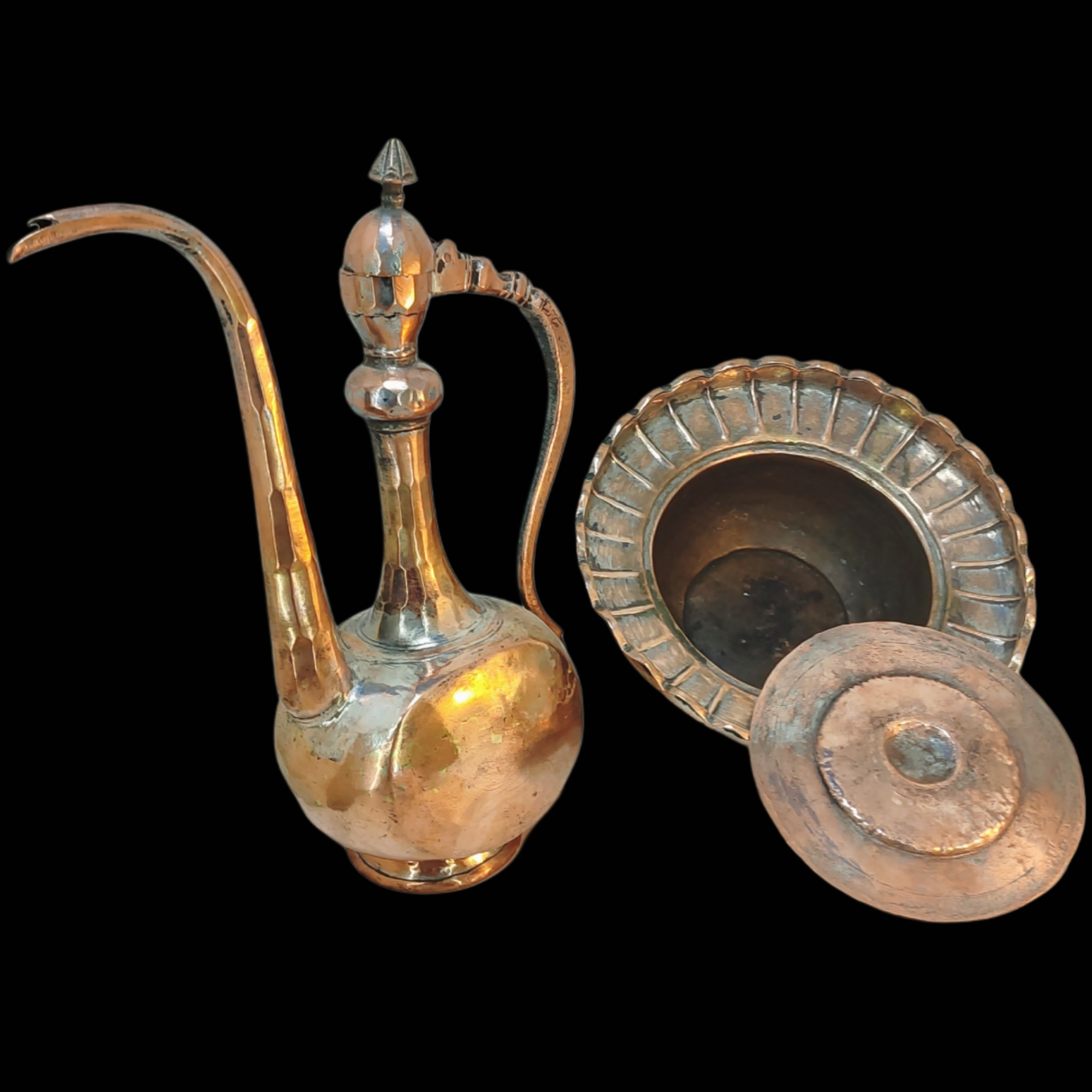 آفتابه لگن خاص و کمیاب که از فلز مس ساخته شده اند و روی دسته ی آفتابه مهر دار است.
