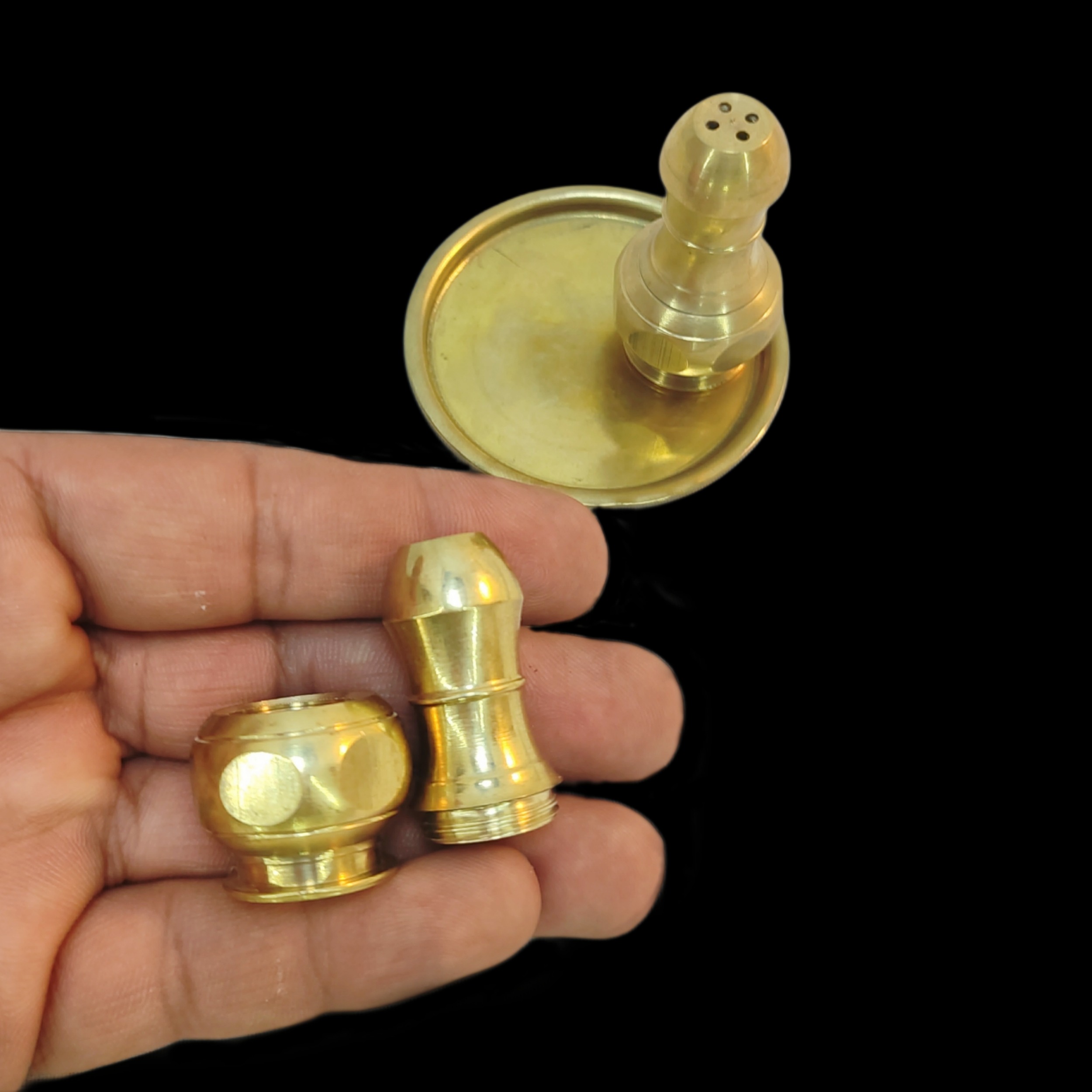 یک جفت نمکدان که جنس آنها از فلز برنج ساخته شده و یک سینی مینیاتوری نیز به همراه جفت نمکدان هااست.