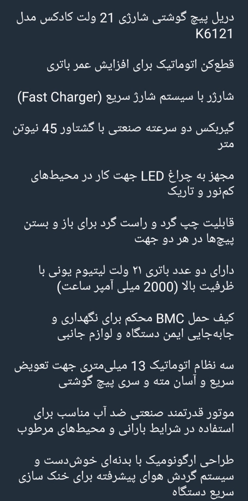 دریل پیچ گوشتی شارجی کادکس k6121 ضد آب صنع