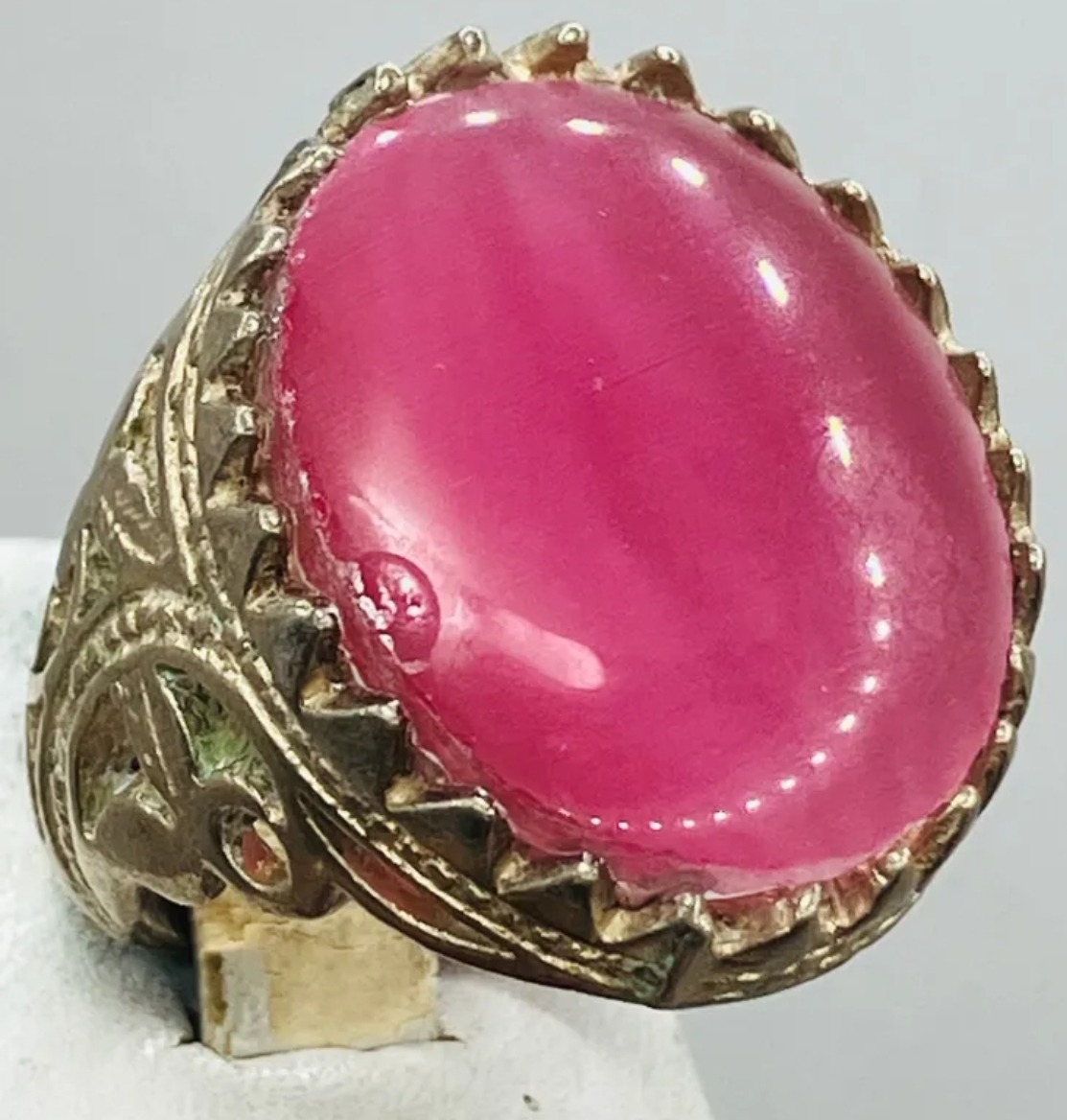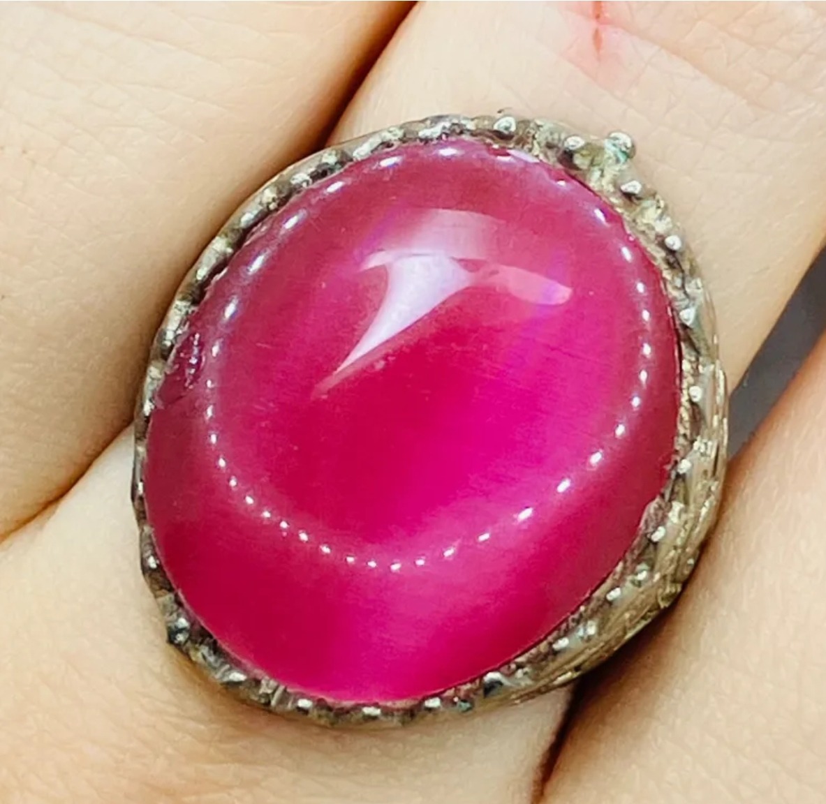 انگشتر نقره با نگین یاقوت صورتی چشم گربه ای تایلندی یه کار خیلی قدیمی هم طرحش هم نگینش حداقل مال پنجاه سال پیش هست ولی با این حال یه کار شیک ازتون خواهش میکنم منصفانه برادرانه خواهش میکنم منصفانه قیمت بدید دمتون گرم راضی به ضرر کسی نشید
