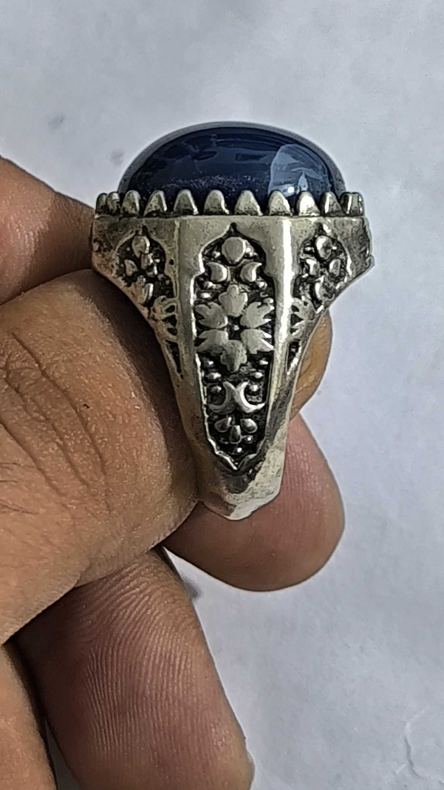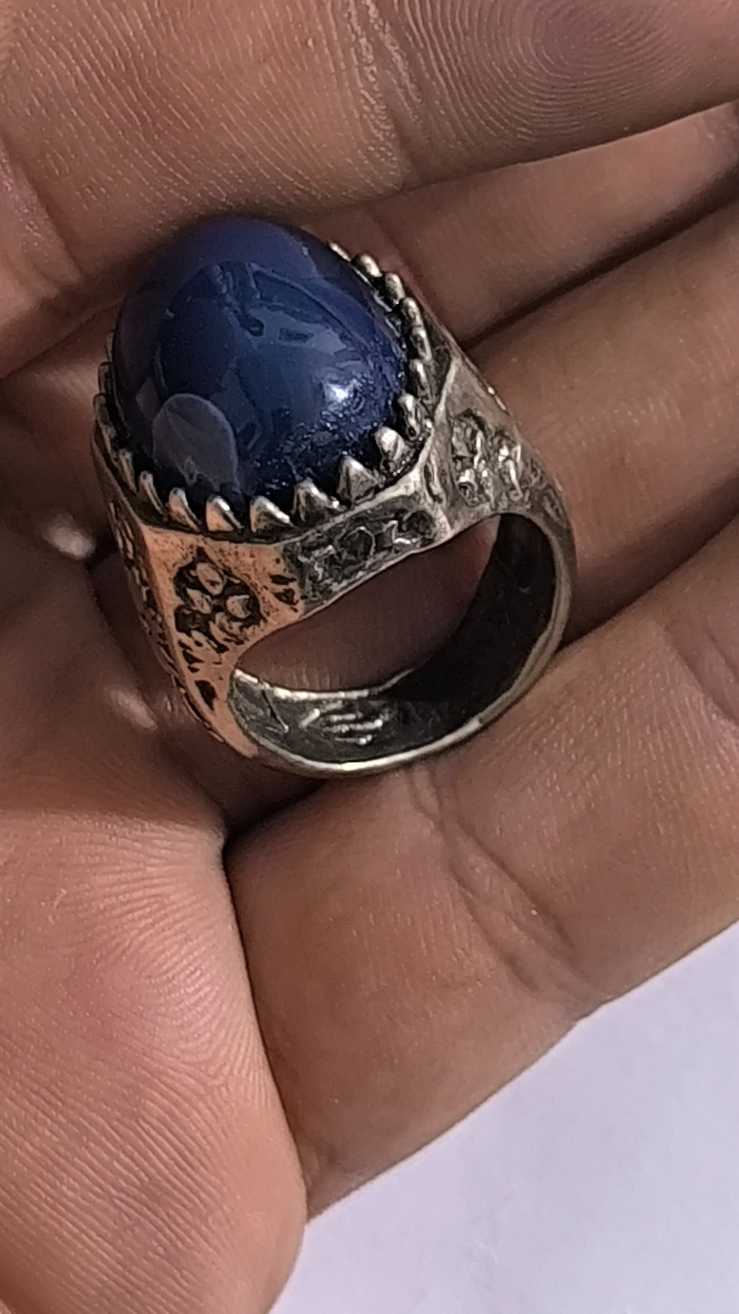 انگشتر نقره با ی رکاب فوقالعادهزیبا  با نگین عقیق آبی آبدار یه رنگ خیلی خاص  یه کار خیلی خفن  فوقالعاده سنگین  ولی با این حال یه کار شیک ازتون خواهش میکنم منصفانه برادرانه خواهش میکنم منصفانه قیمت بدید دمتون گرم راضی به ضرر کسی نشید  هر مغازه ای بری فقط نگینش رو باید پونصد هزار تومان بخرید چه برسه به رکابش پس لطفاً درست قیمت بزارید که منم بتونم براتون ارسال کنم الان فقط ارسالش صد هزار تومان باید از جیب بدم