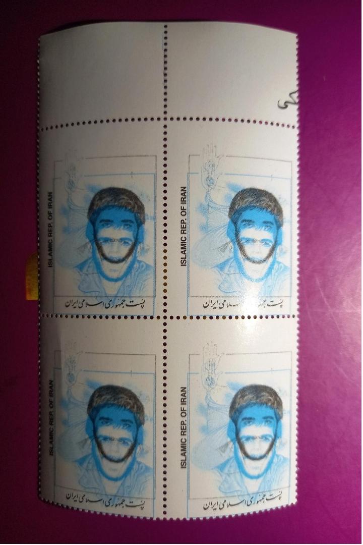 تمبر بلوک 150 ریال باند بالا دپلاسه رنگ ودندانه شدید تنها رنگ آبی ومشکی چاپ شده