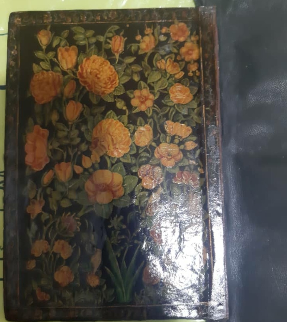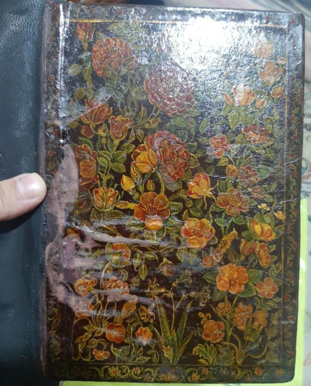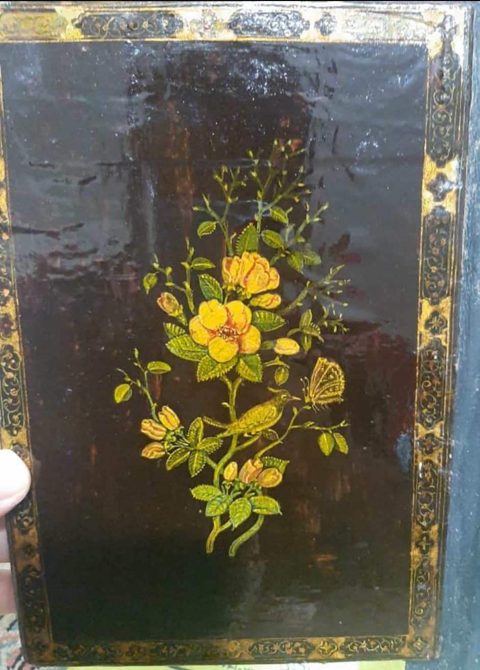 جلد پاپیه ماشه با چهار نگاره گل و مرغ روغنی روی جلد و داخل جلد