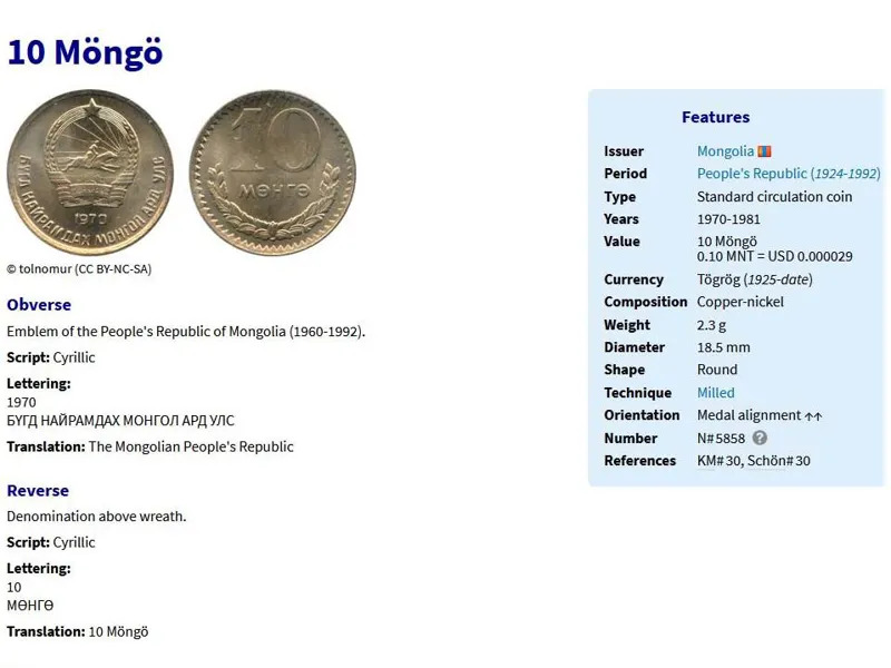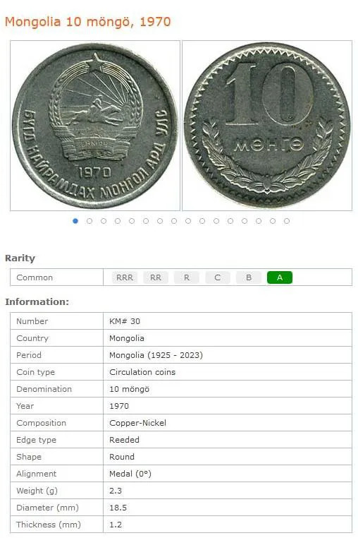 سکه 10 مونگو مغولستان 1970 (نایاب)