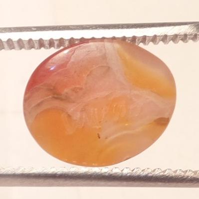 طرح : یک قطعه نگین عقیق چند رنگ ترکیبی رگه دار و زیبا و خوش رنگ و خوش طبع و با تراش بیضی ارتفاع دار و دیواره دار رو و زیر نسبتا محدب.