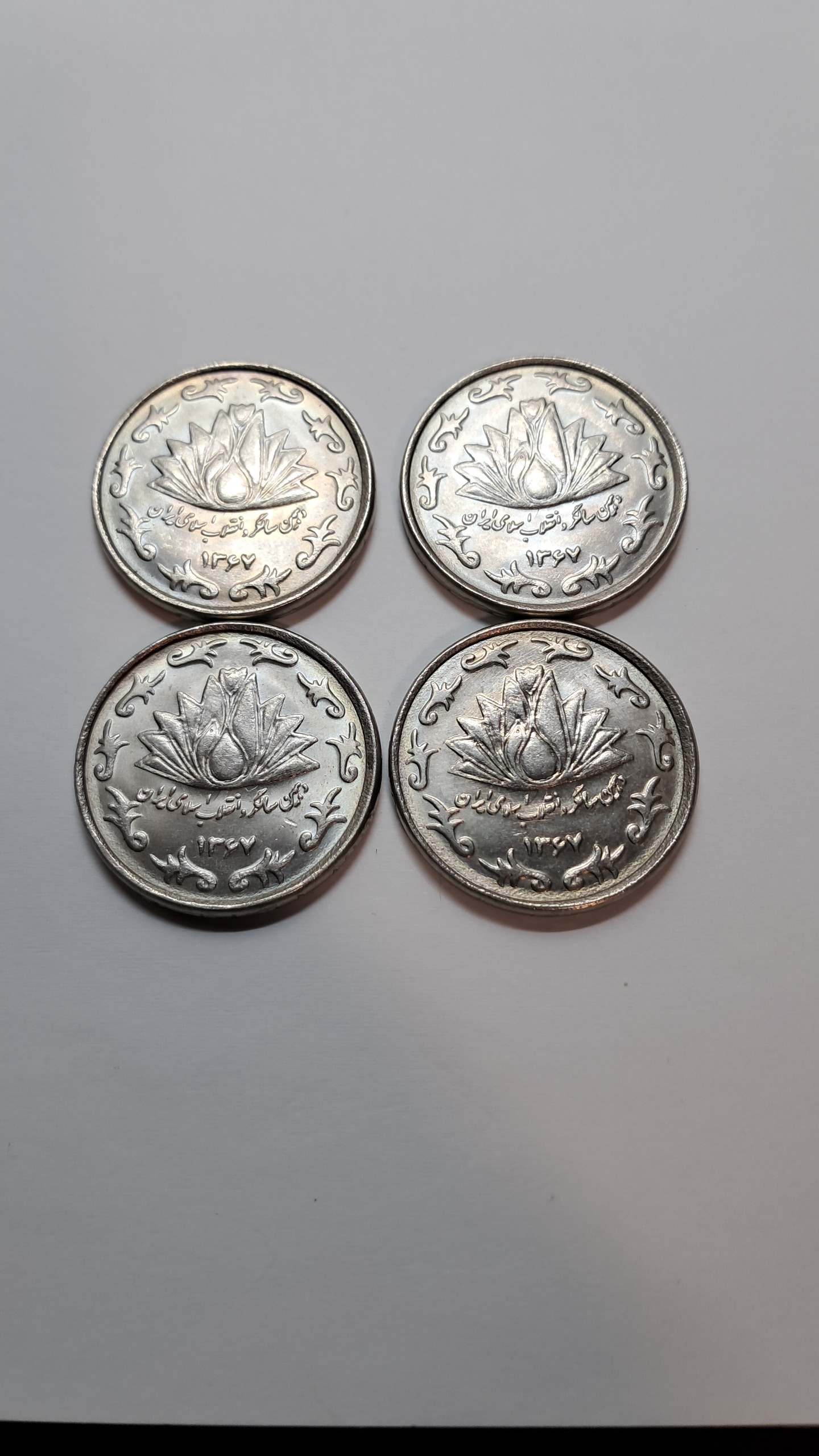 4 عدد سکه 50 ریالی مناسبتی دهمین سالگرد 1367 نو وسالم که هر 4 سکه انعکاس 2 طرفه دارد [ نوشته دور سکه بانک مرکزی جمهوری اسلامی ایران ]