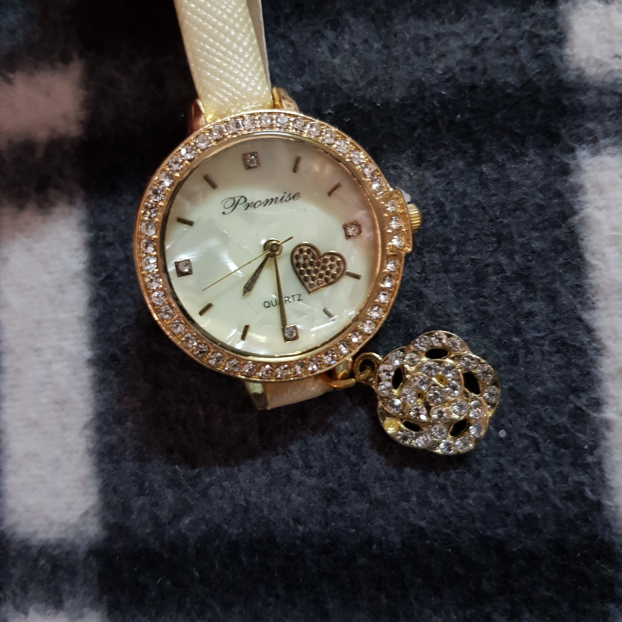 فقط یکی از نگین های روی گل آویز ساعت افتاده است و روی یک طرف بند کمی اثر خم شدگی هست.
