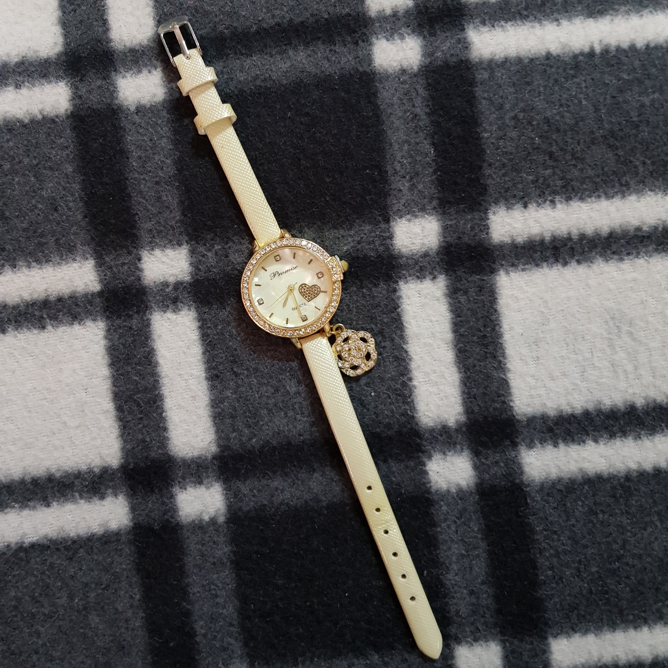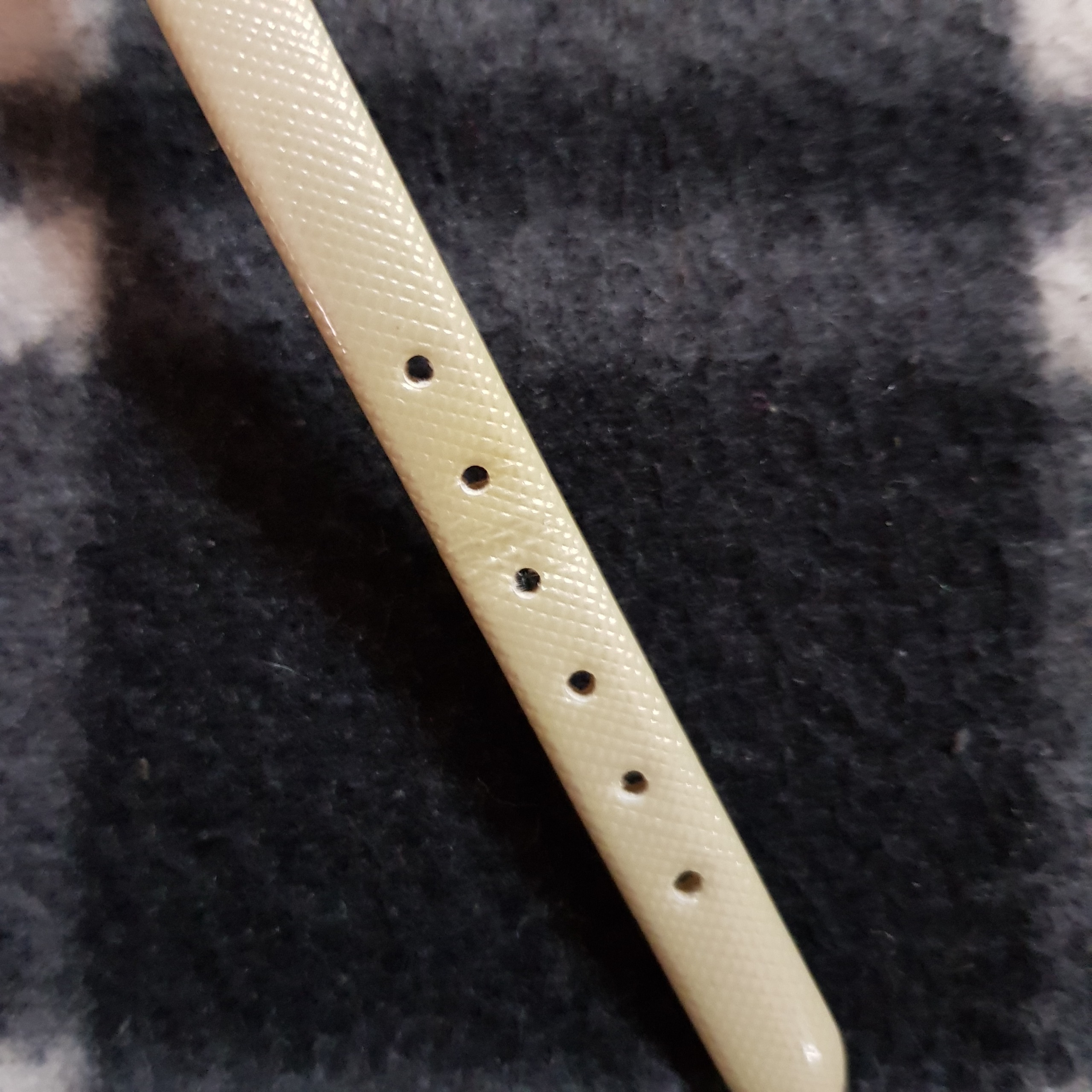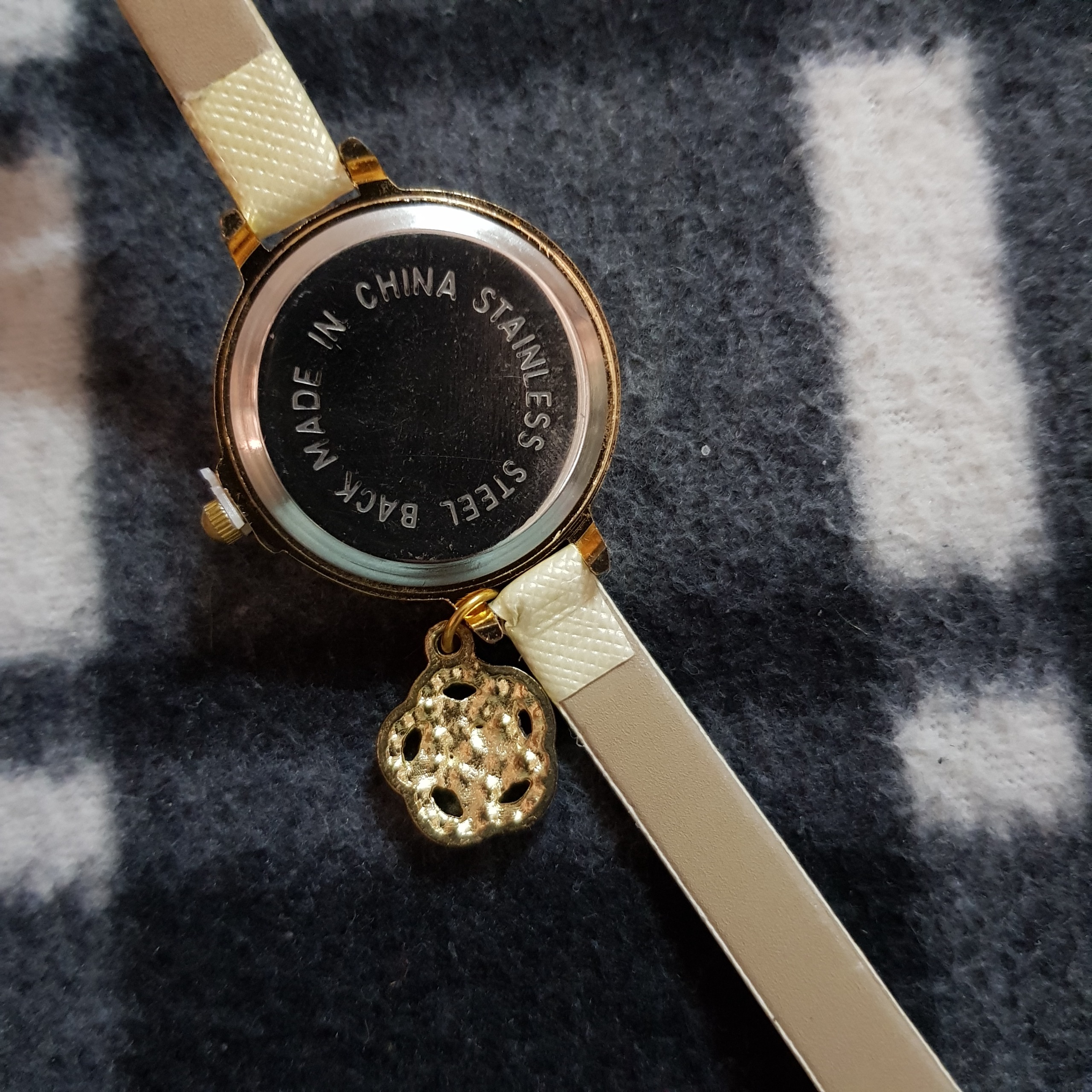رنگ بند و صفحه ساعت شیری، قطر صفحه ساعت حدود 3.3 سانتیمتر و ضخامت بند آن حدود 0.7 سانتیمتر است.