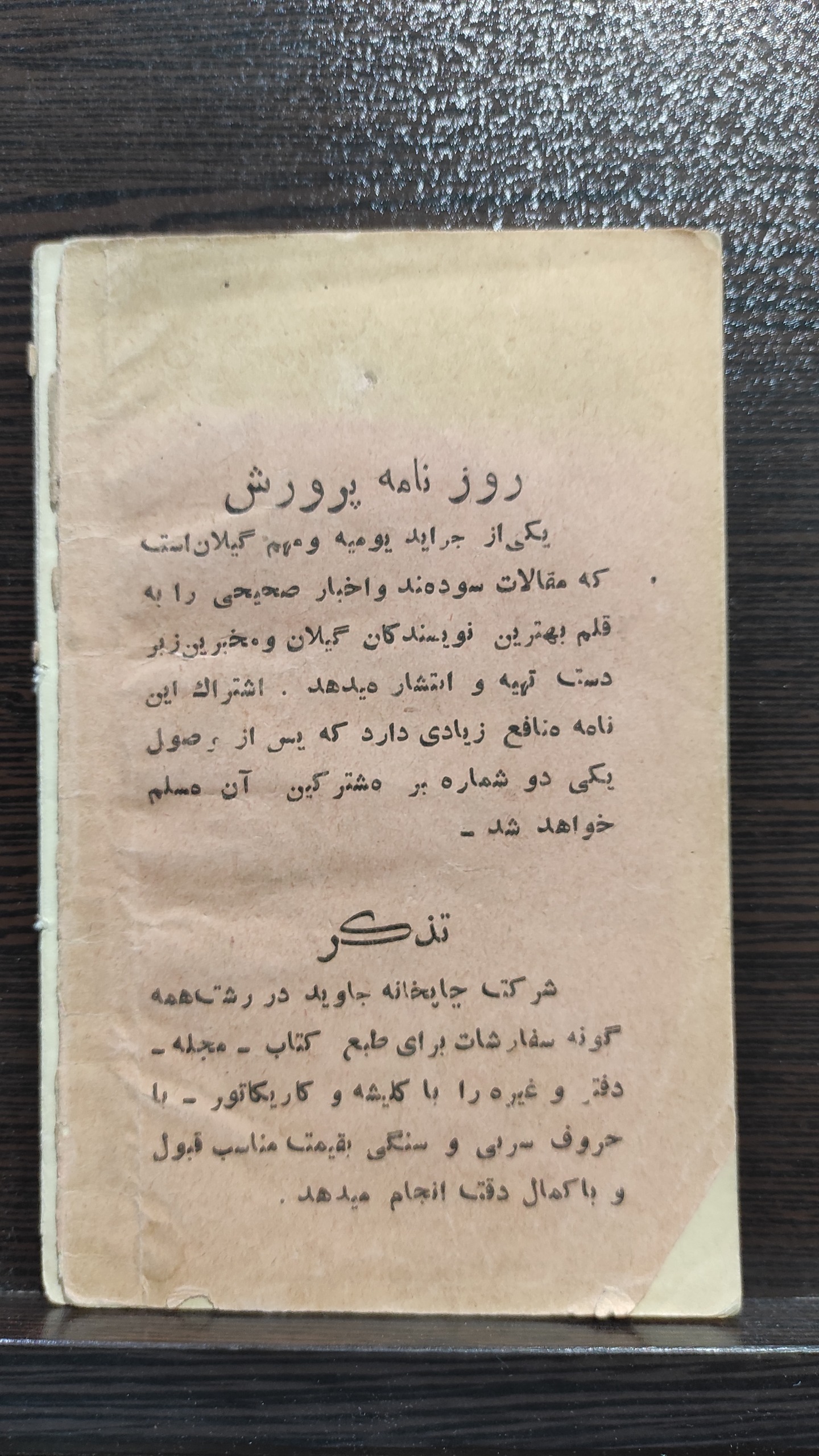 [  ]  خریدار محترم لطفا با دقت به توضیحات هر کالا دقت بفرمایید کالاها کیفیت شان مطابق با تصویر هست و انواع کتاب، مجله، روزنامه، اسناد و عکسهای قدیمی از دوره قاجار تا پهلوی و اوایل انقلاب موجود میباشد باقیمت ارزان، تمامی پست ها به سراسر ایران پیشتاز ارسال میشود مبلغ پست سایت ایسام تعیین میکند و امکان برگشت هزینه پست وجود ندارد در صورتی که بیش از دو میلیون تومن خرید کنید هزینه پست رایگان میباشد کالاها اکثرا دست دوم میباشد احتمال هرگونه آسیب دیدگی و خط خوردگی و غیره دارند لطفا توضیحات مربوط به هر کالا با دقت بخوانید این فروشگاه کالاها با قیمت ارزان در اختیار مشتریان قرار می دهد با تشکر از شما تاخیر در ارسال کالا به آن جهت است که در انبار مشغول آماده سازی سفارشات شما خریداران گرامی میباشم خریداران گرامی توجه فرمایید کتاب مجله روزنامه قدیمی با هر کیفیت در فروشگاه عرضه میشود خواهشمندم توضیحات با دقت بخوانید و فیدبک مثبت را ثبت کنید و از ثبت فیدبک منفی پرهیز کنید و هر گونه سوالی دارید بپرسید چون در برخی از خریدها شما هزینه پست پرداخت میکنید بسیار کم هست لطفا اضافه هزینه پست را به این حساب واریز بفرمایید ممنون میشم