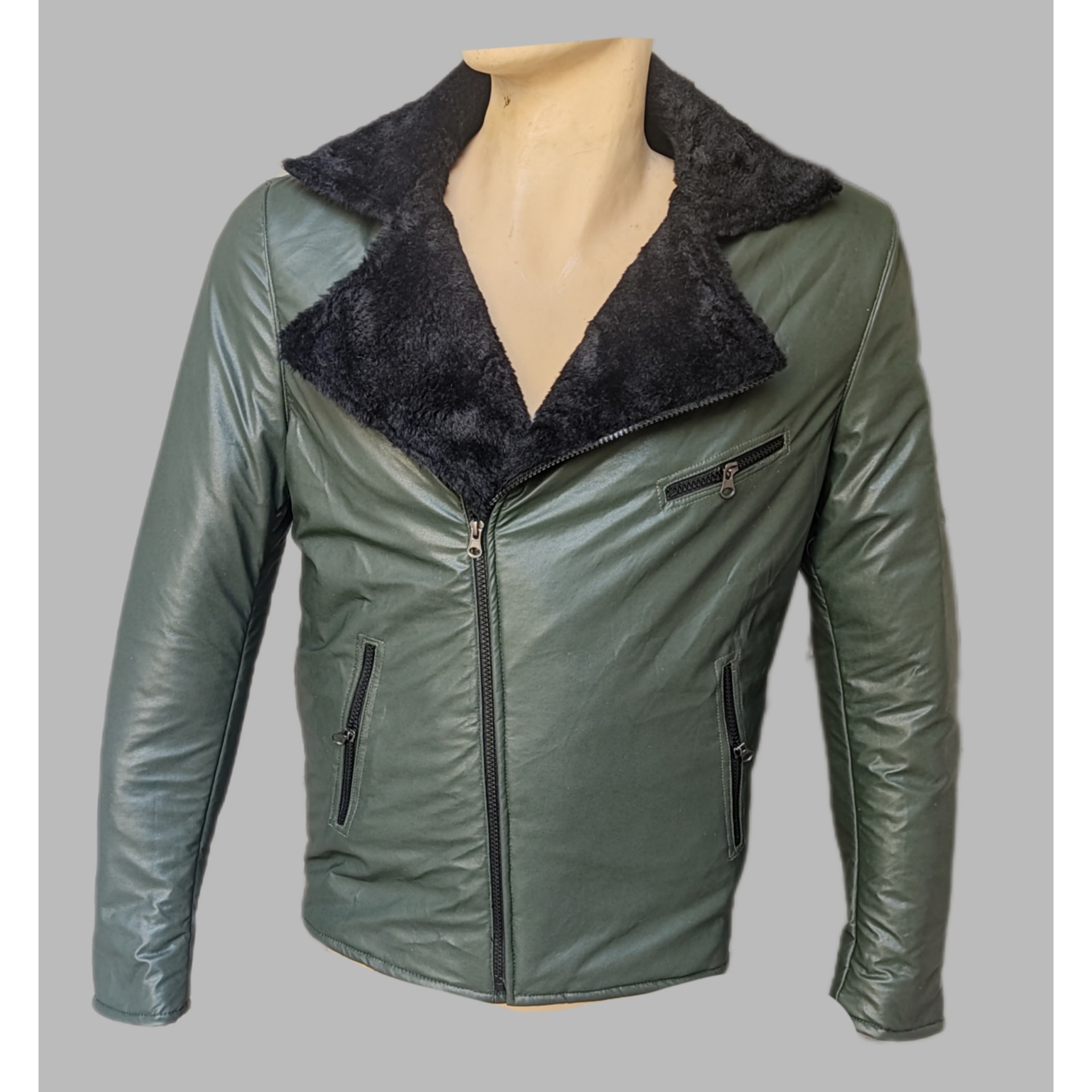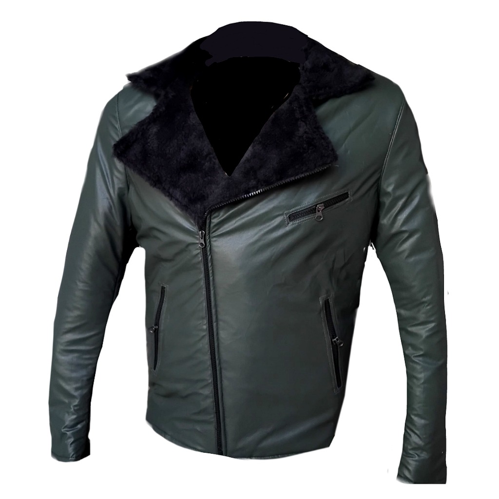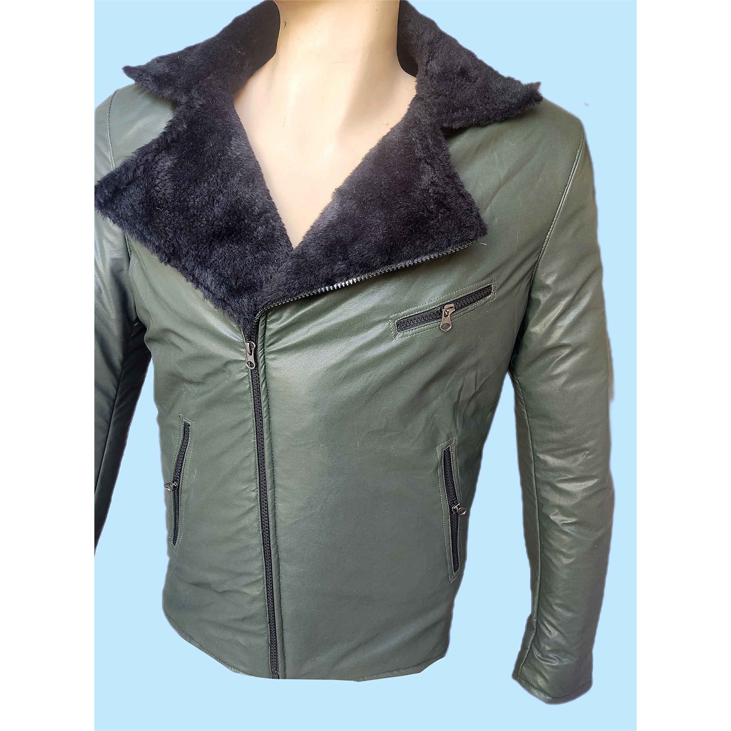 کاپشن مردانه چرم مصنوعی مدل زیپ کج یقه خز رنگ رویه سبز ارتشی رنگ خز مشکی تن پوش شیک و اسپرت و خاص تن پوش جذب قابل استفاده بر روی موتور سیکلت و روزمره و مهمانی دارای زیپ دم آستین