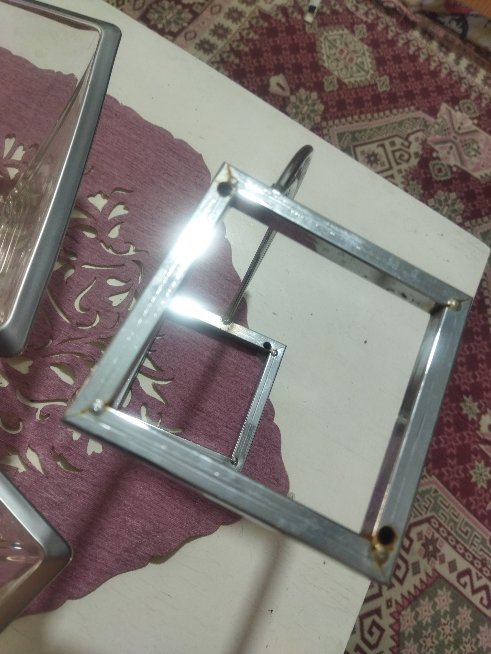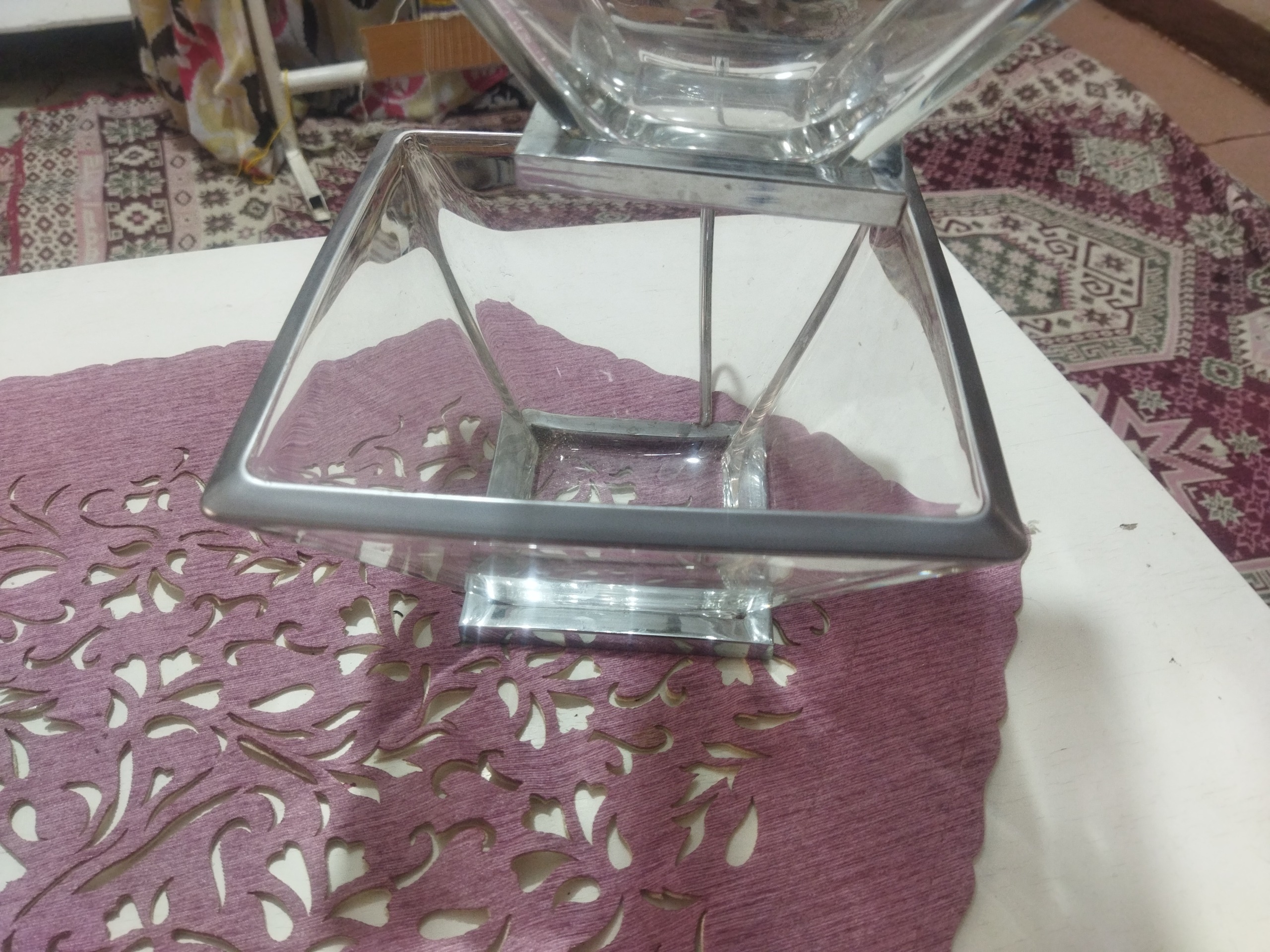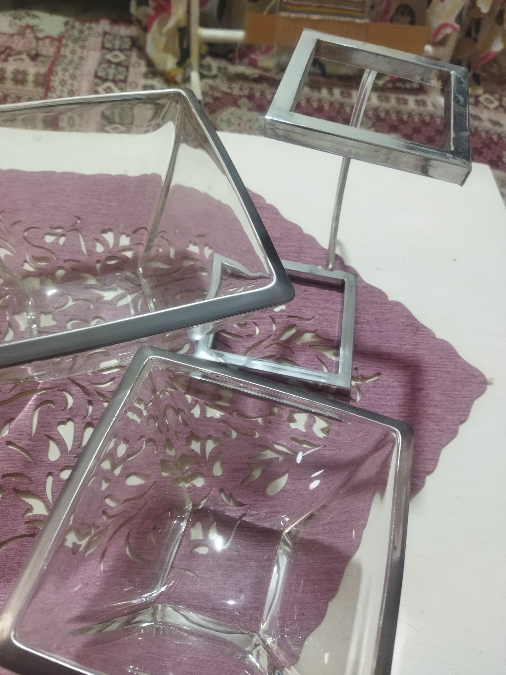 ظرف بلوری مخصوص پذیرایی غذا، دو عدد ظرف هست با یک پایه فلزی، هر ضلع ظرف بزرگتر 19 سانتیمتر و هر ضلع ظرف کوچکتر 14 سانتیمتر است . اصلا استفاده نشده کادو بوده چون از کادودهنده خوشم نمی اومد کنار گذاشتمش پایه هاش یه کوچولو رنگ زنگ گرفته که تو عکس مشخصه زیر ظرف هست . دورش هم رنگ نقره ای ، جنسش هم نمی دونم مال کجاست وزنش هم دو کیلو هست کلا .