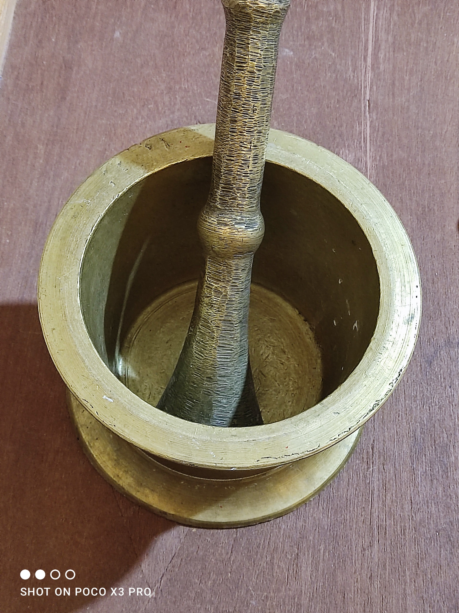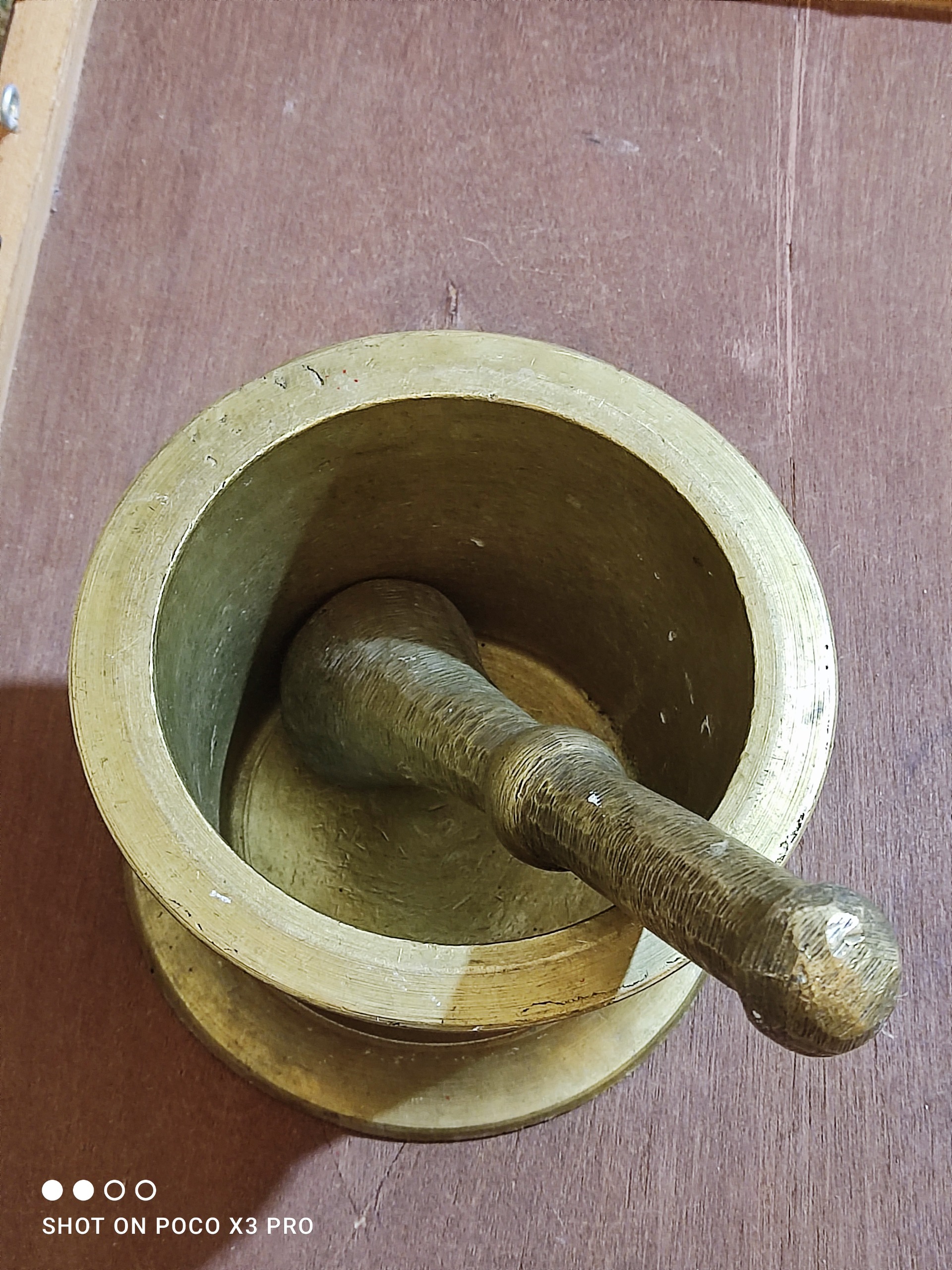 یک عدد هاون قدیمی برنجی سایز بزرگ و سنگین کهنه و قدیمی و دستساز مطابق تصاویر وزن این هاون حدود پنج کیلوگرم میشه با دستش