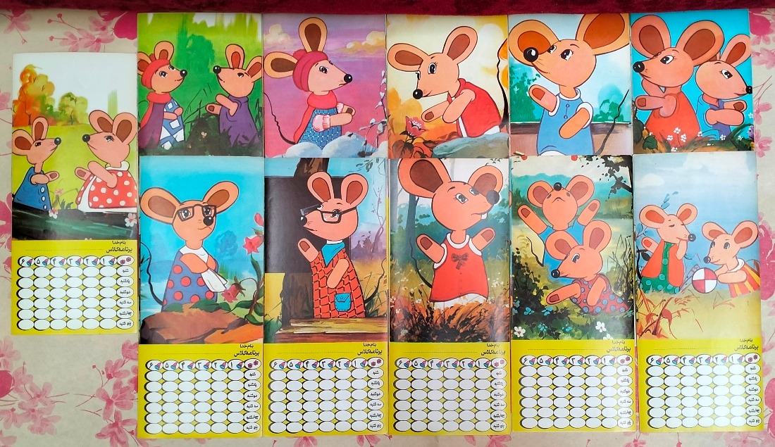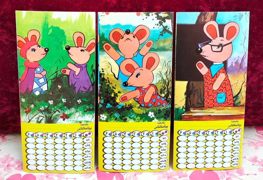11 مدل مختلف برنامه هفتگی برچسبی مدرسه موشها ، اصل و کلکسیونی ، آکبند قدیمی ، چاپ دهه 60 ، سایز 8 سانت در 20 سانت ، ته انباری ، مطابق عکسها