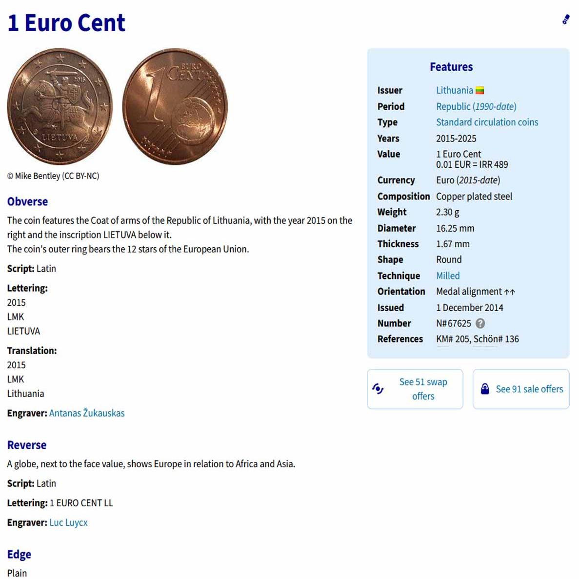 سکه 1 سنت یورو لیتوانی 2015 (کمیاب)