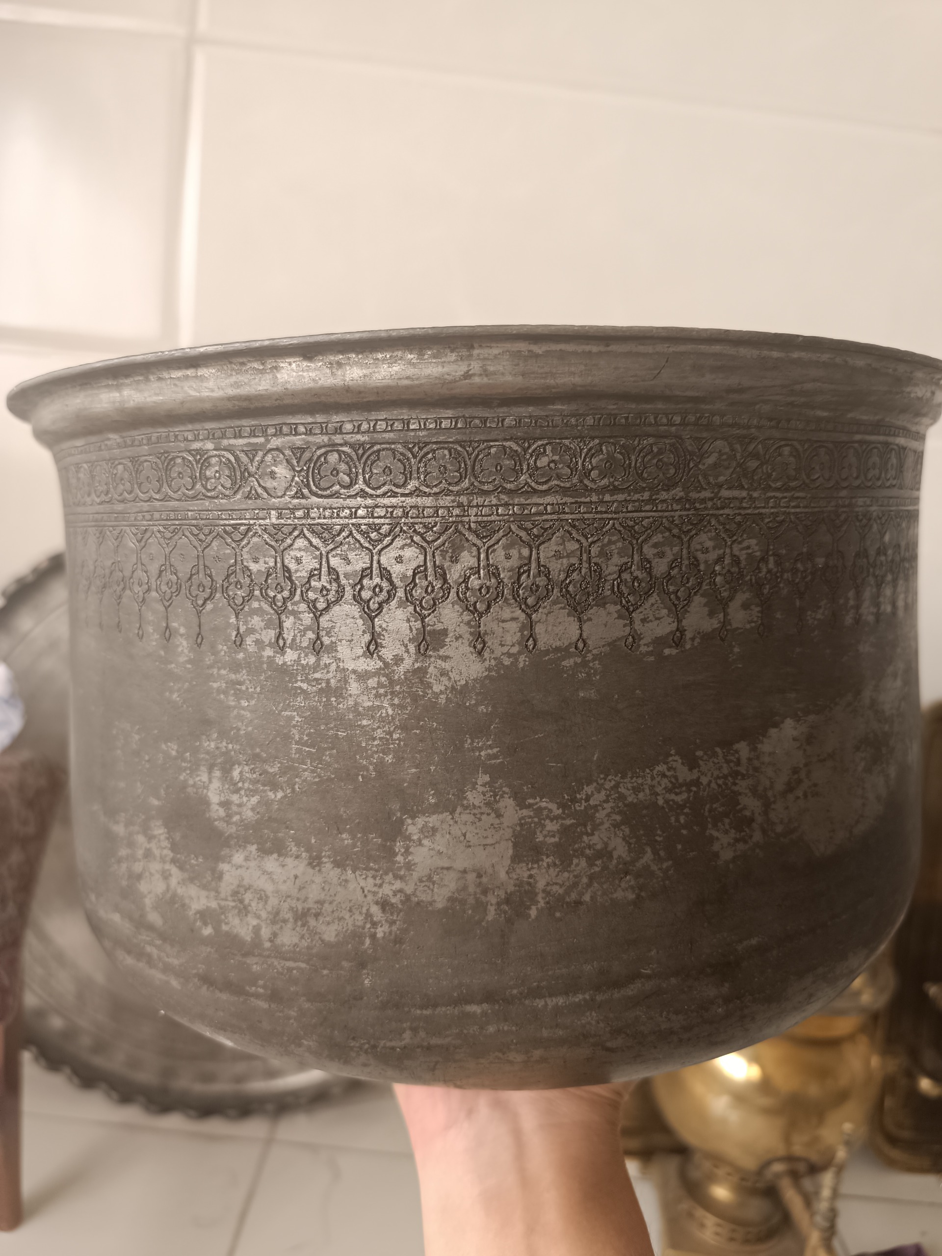 بادیه قلم یزدی کهنه بکر و سلامت بدون هیچ ایرادی دور لبه کار تماما قلم داره قطر دهانه 34سانت و ارتفاع 25سانتی متر