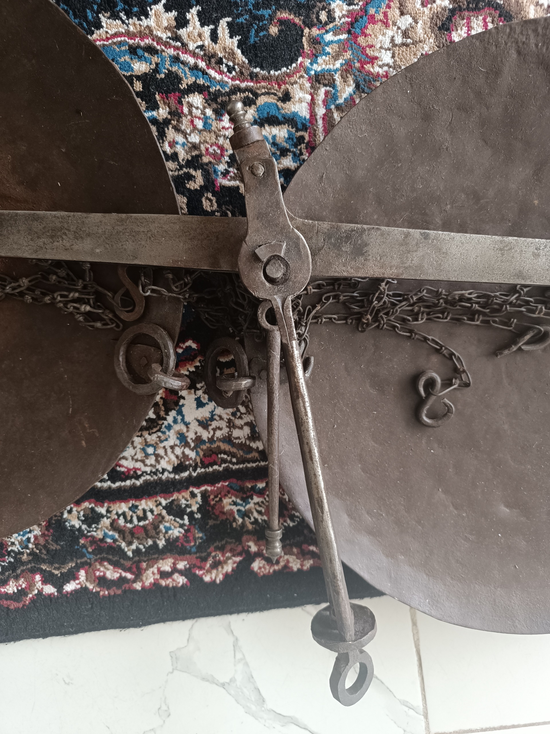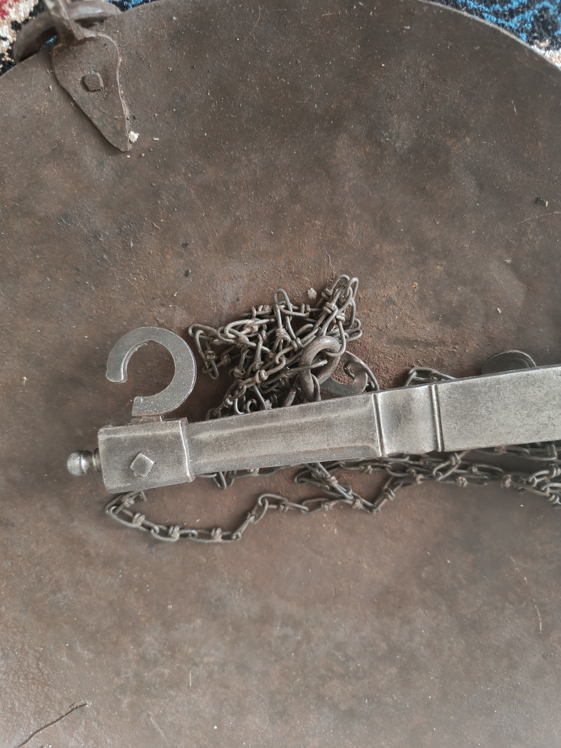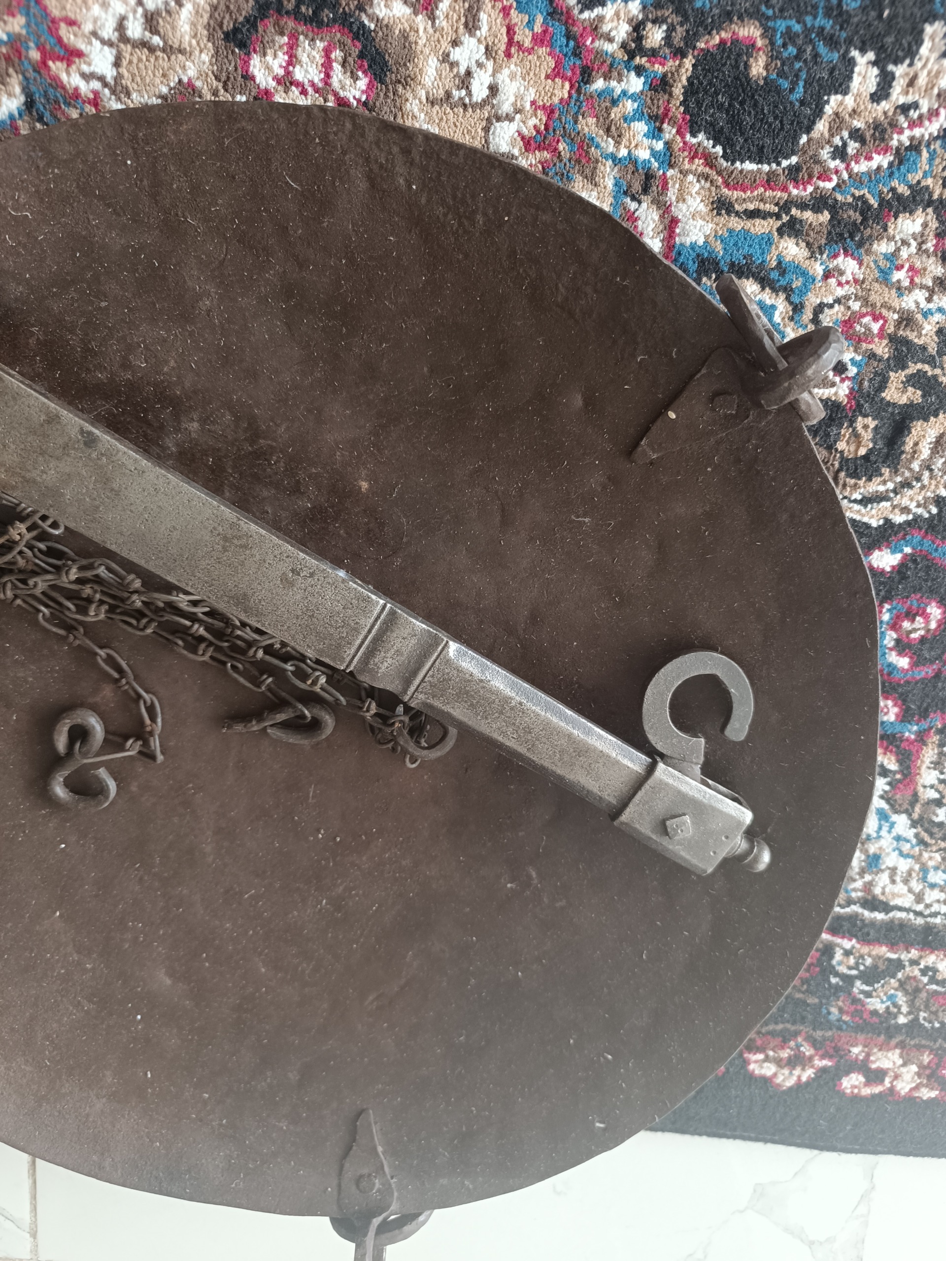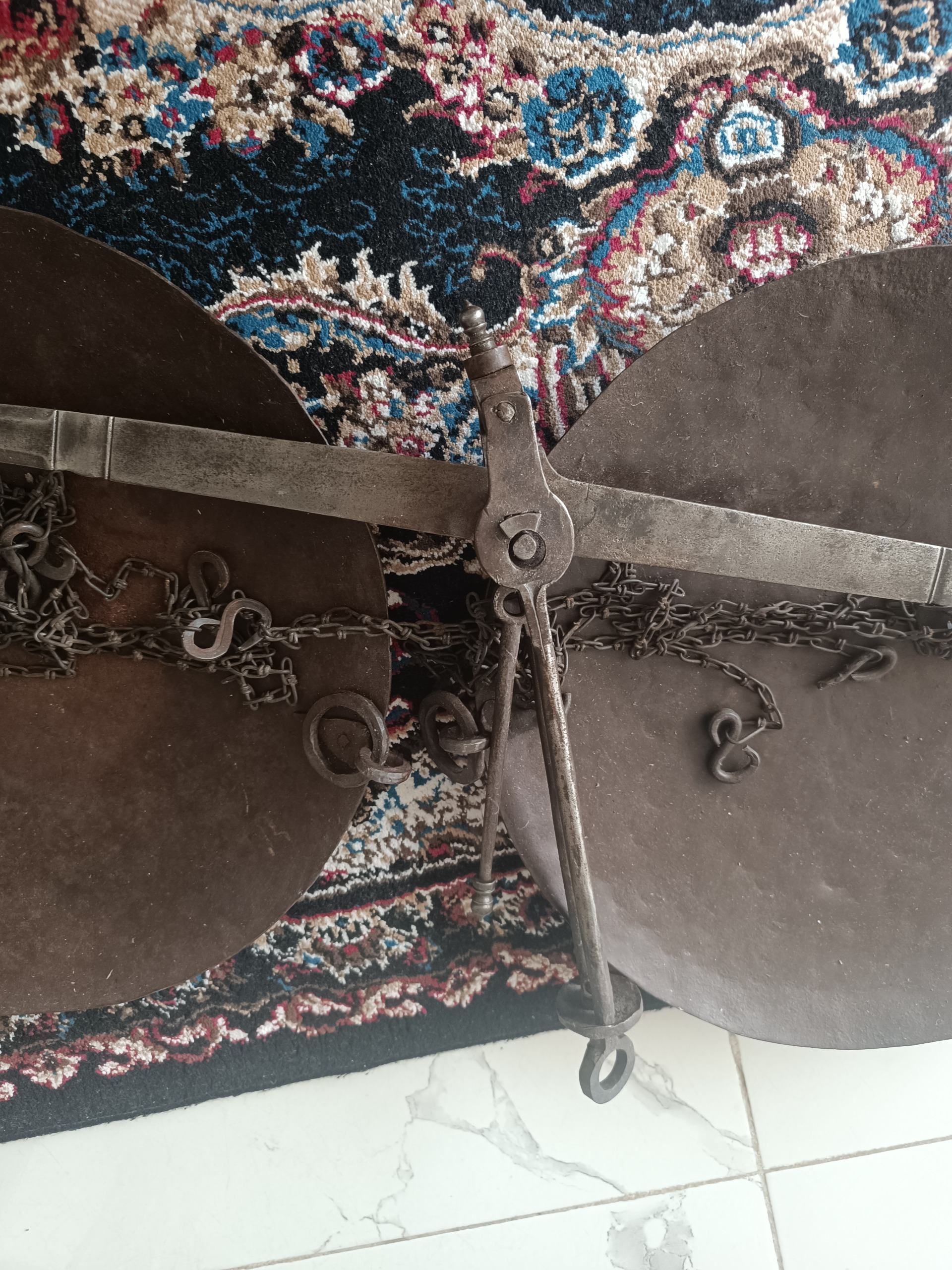 ترازو غول پیکر فولادی روس کاملاً سالم طول شاهنگ 74سانتی متر و کفه ها هر کدام قطر 43 سانتی متر تمام فابریک حتی زنجیر و کفه کامل هست کار کهنه و کلکسونی هست بازم سوالی بود در خدمتم