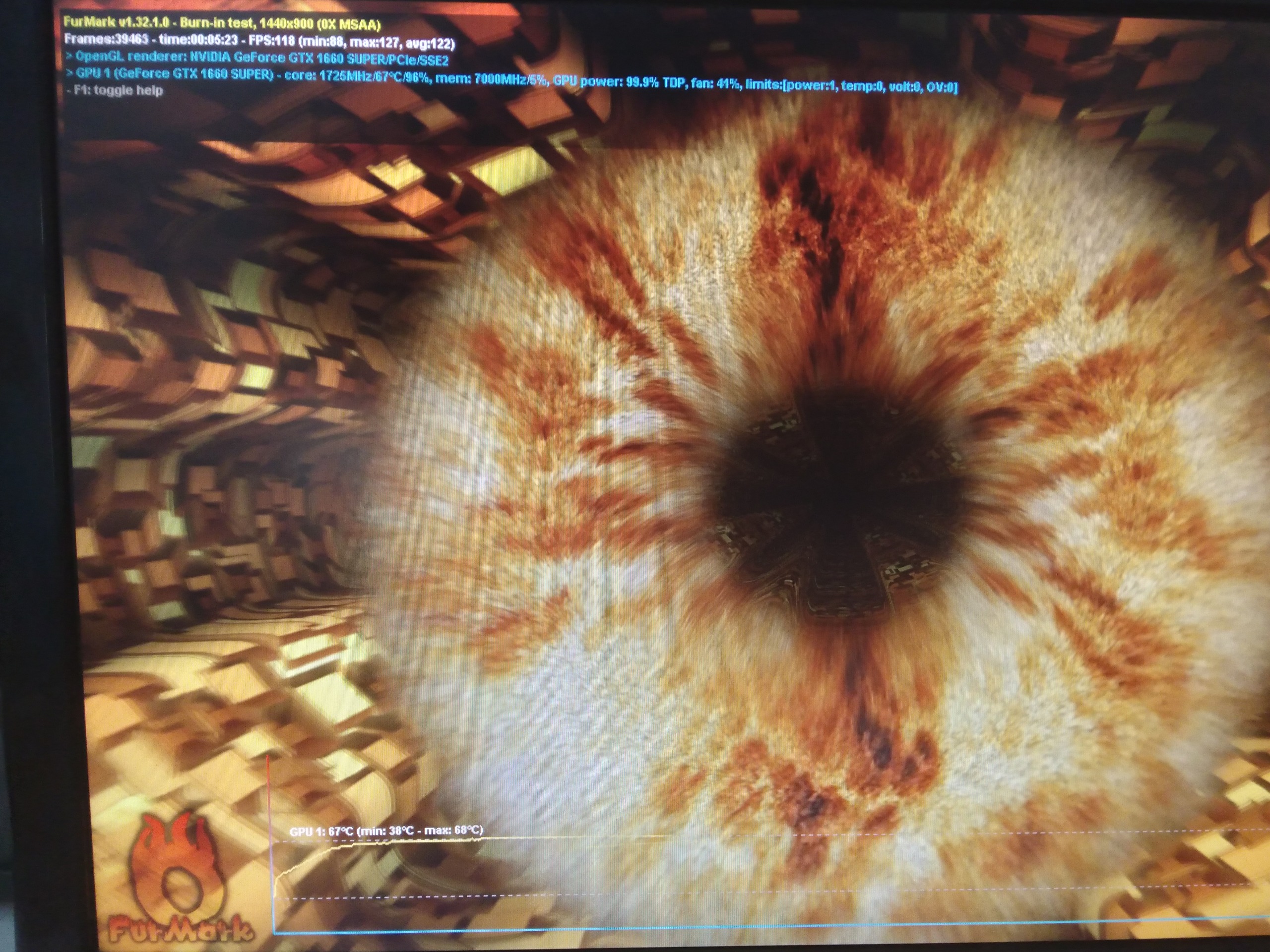 اوج دمای کارت در تست فورمارک حدود 5 دقیقه تقریبا به 67 درجه میرسد که نشان از سلامت عالی این کارت گرافیک میباشد