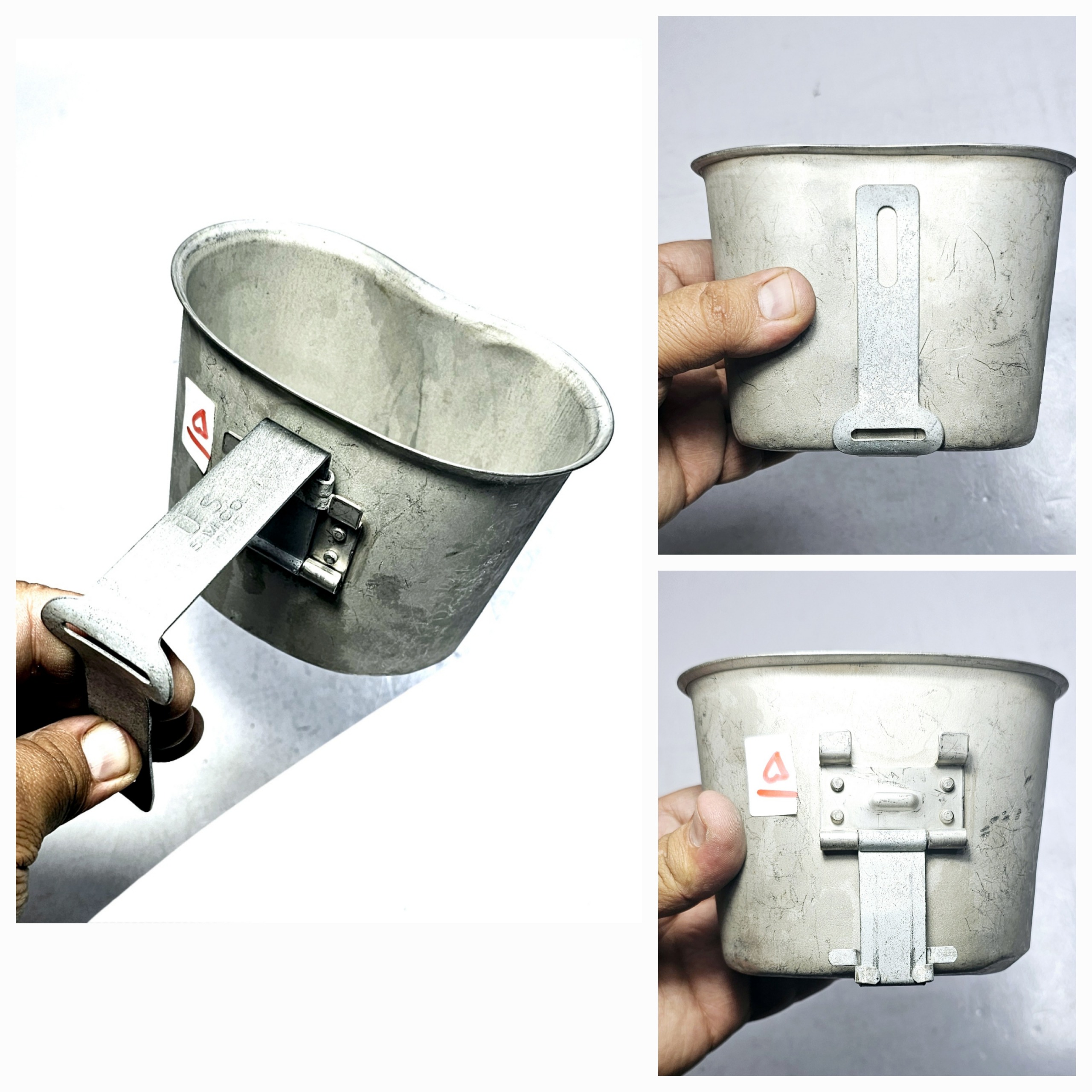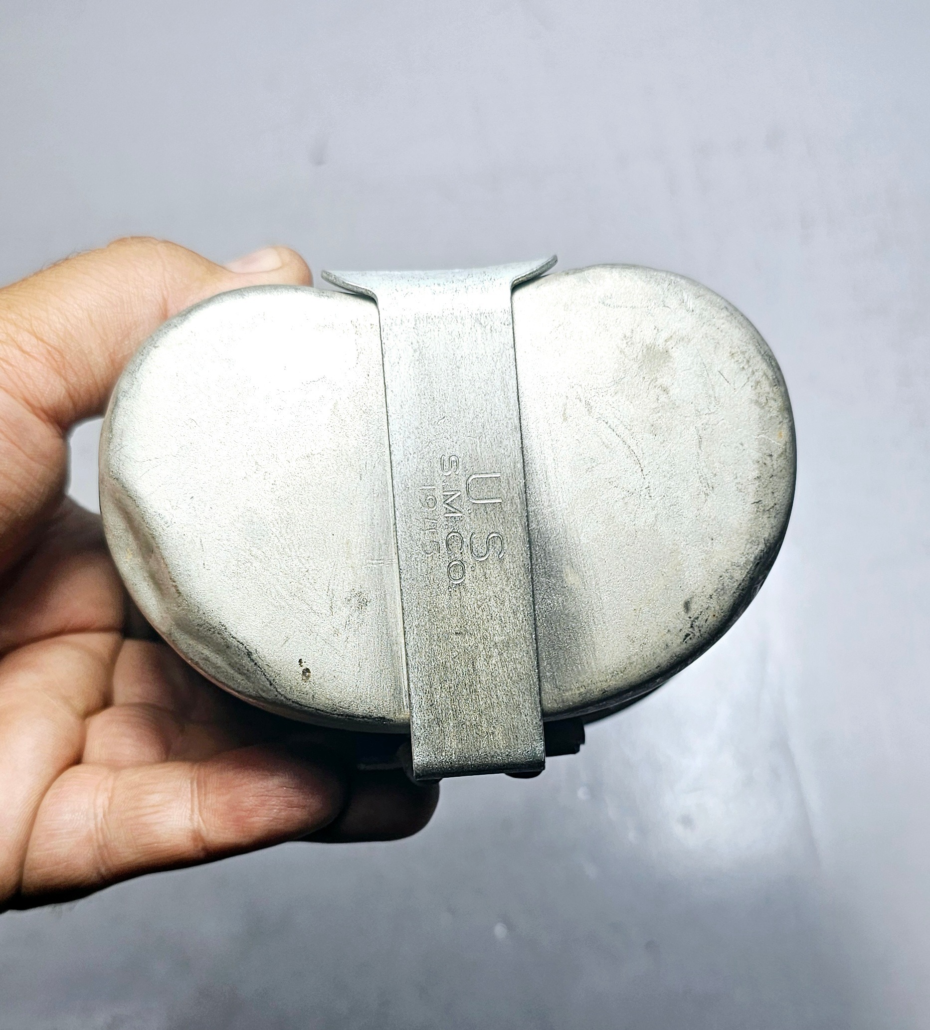 جا قمقمه ای آمریکایی نظامی اصلی یا یقلوی قمقمه نظامی با کیفیت عالی و قدیمی ، سال تولید 1945 , سال ساخت ، کشور و مشخصات روی دسته حک شده است ، به علت قدمت دارای خط و خش و فرورفتگی های جزئی و زنگار میباشد که در تصاویر مشخص است