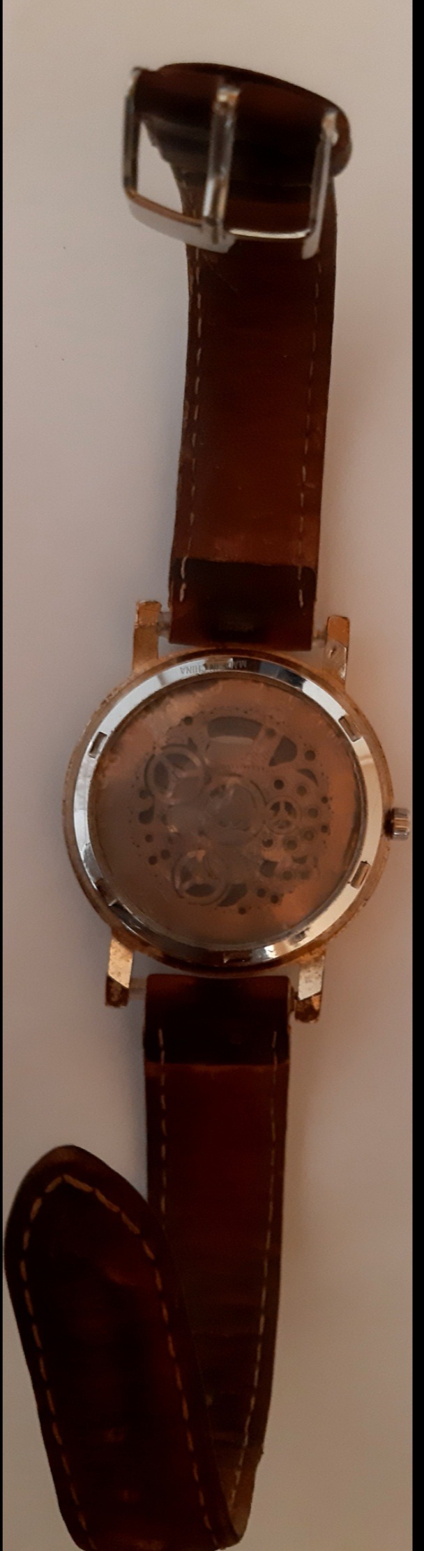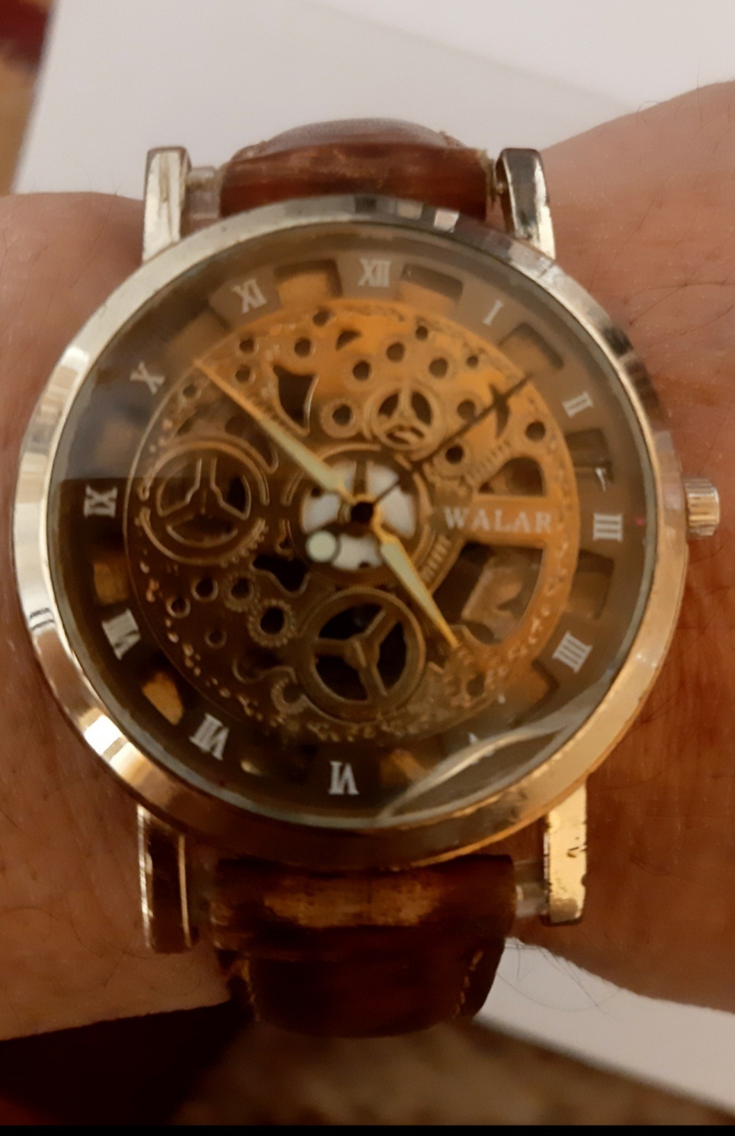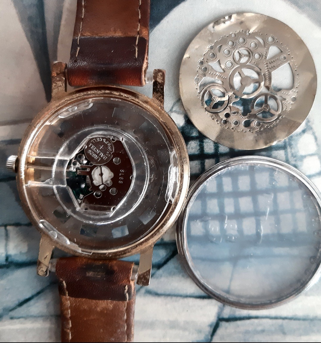 موتور کوارتز و پشتش شفاف که اون طلایی ها پشت درب صفحه ورقه ای نمایشی هست و مدل موتورش کوارتز معمولی بادرب پشت فشاری و شیشه بوده قبلن و بخاطر ترک داشتن،طلق اندازش بریده و نصب شده، گوشه های بند بخاطر کوچکتر بودن بندبا واشر لاستیکی فیکس شده پایین شیشه ترک ریز دارد که ازقیمت کسر شده و بخاطر قوس دار بودن شیشه و فابریک بودنش تعویض نشده،سبک و راحت روی دست