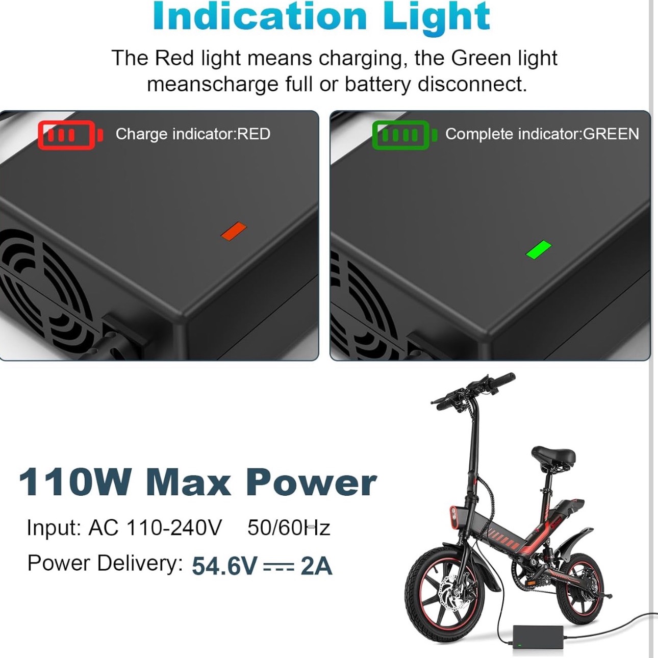 شارژ با هدایت LEDچراغهای نشانگر قرمز/سبز: قرمز = فعال بودن شارژر باتری 54.6 ولت 2 آمپر؛ سبز = شارژ کامل یا خطا ( در صورت سبز بودن هنگام راهاندازی، فوراً اتصال را قطع کنید). برای ایمنی شارژر 48 ولتی: اگر ولتاژ باتری کمتر از 35.7 ولت است، هرگز از آن استفاده نکنید.