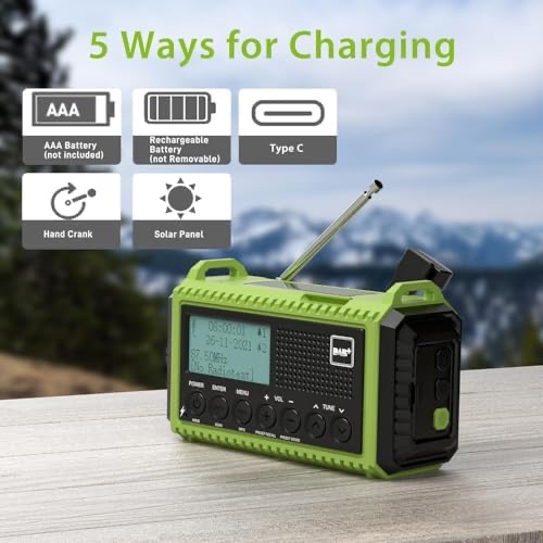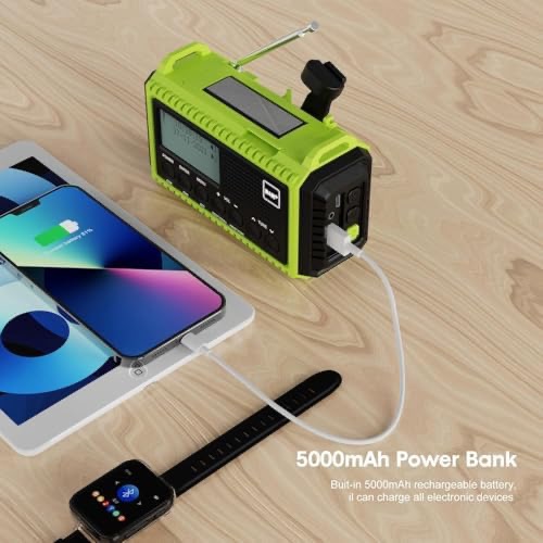 پنج روش شارژ و رادیو اضطراری: رادیو DAB+ از طریق کابل USB، پنل خورشیدی، باتری AAA (شامل نمیشود)، باتری داخلی با ظرفیت بالا یا هندل. دارای باتری قابل شارژ 5000 میلیآمپر ساعتی است، همچنین میتوانید تلفن همراه یا سایر دستگاههای خود را از طریق کابل USB شارژ کنید. در مواقع اضطراری یا ماجراجویی در فضای باز، رادیو خورشیدی هندل میتواند به عنوان منبع تغذیه استفاده شود که بسیار مناسب است. بند دستی و کارابین، اتصال آن را به کوله پشتی آسان میکند. چراغ قوه پرنور و چراغ مطالعه تاشواین رادیو خورشیدی دارای یک چراغ قوه و یک چراغ مطالعه است، دو گزینه روشنایی وجود دارد: روشنایی زیاد یا روشنایی معمولی. یک چراغ قوه پرنور میتواند نور و دید بهتری را در تاریکی برای شما به ارمغان بیاورد، چراغ مطالعه تاشو میتواند زاویه را برای مطالعه آسان در شب تنظیم کند. نیازهای مختلف شما را برای استفاده در شب برآورده میکند.