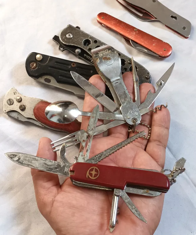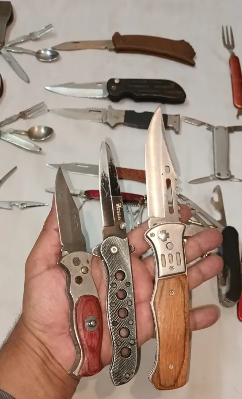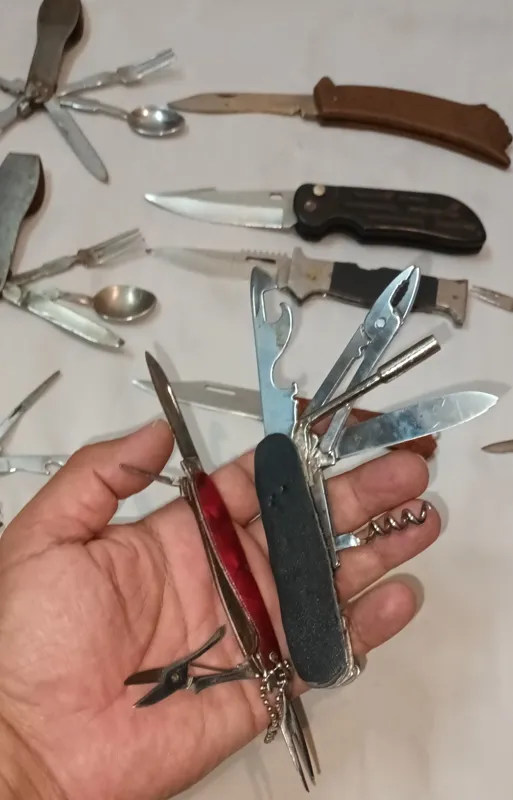 16عددچاقوی سفری وکوهنوردی..کارکرده هستن و فرسودگی دارن،قفل بعضی ازچاقوهاکارنمیکنه،ولی قابل استفاده هستن،قیمت مال همه است،تکی کمتراز5 عددفروش ندارم