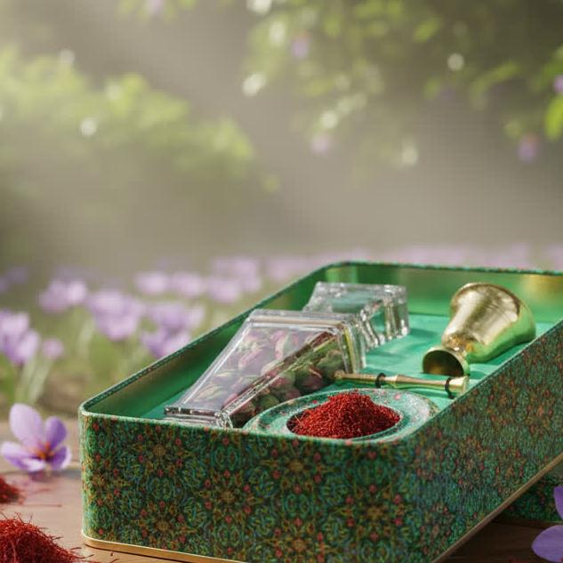 زعفران و گل محمدی موجود در این پک از مرغوبترین نمونه های ایرانی انتخاب شده اند و بدون هیچگونه افزودنی یا رنگ مصنوعی عرضه می شوند. - طراحی سنتی و ماندگار