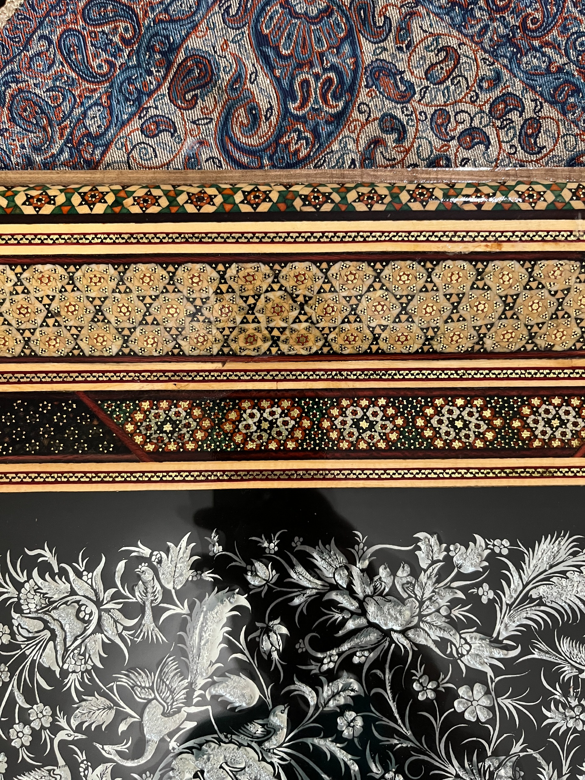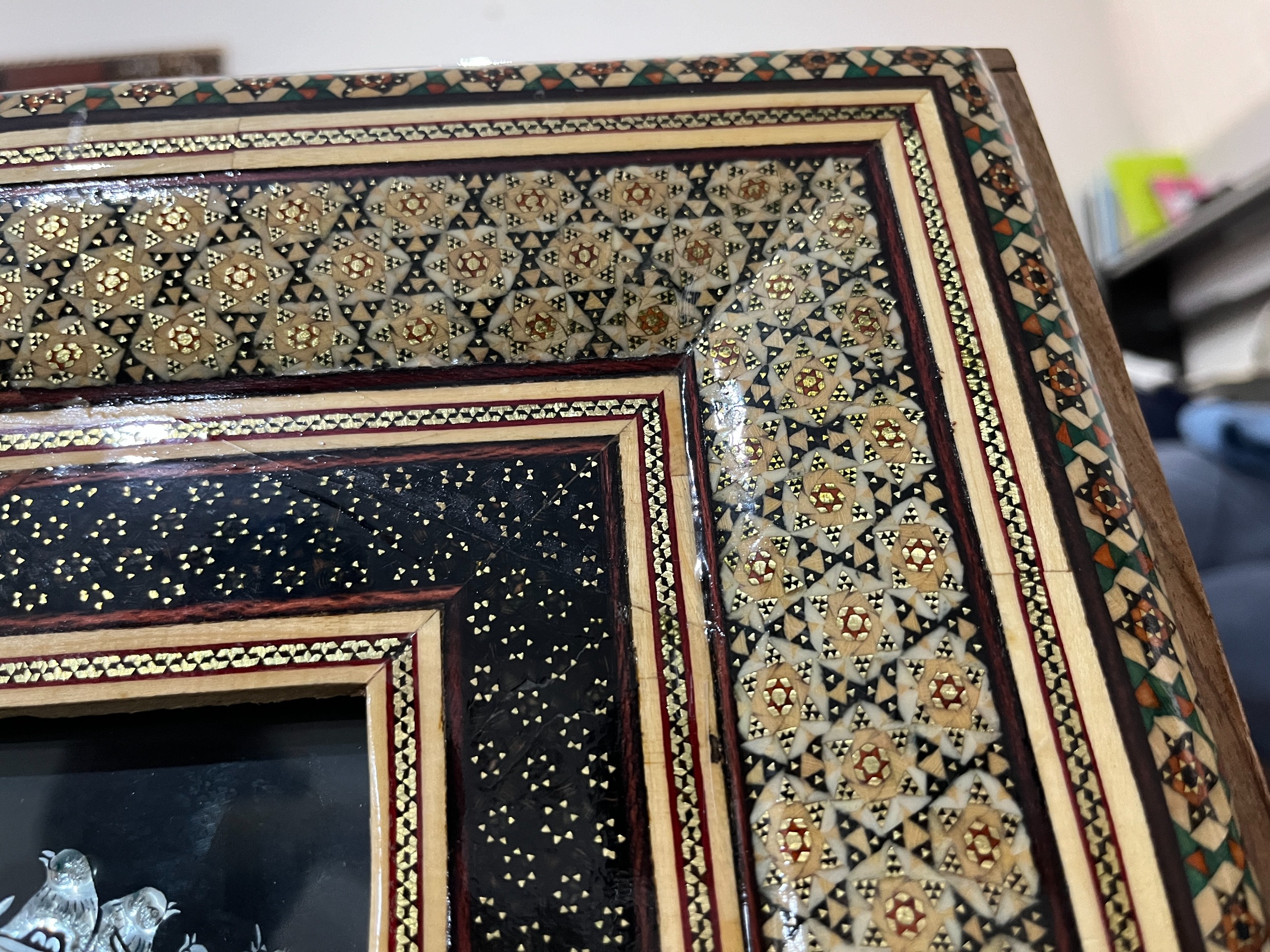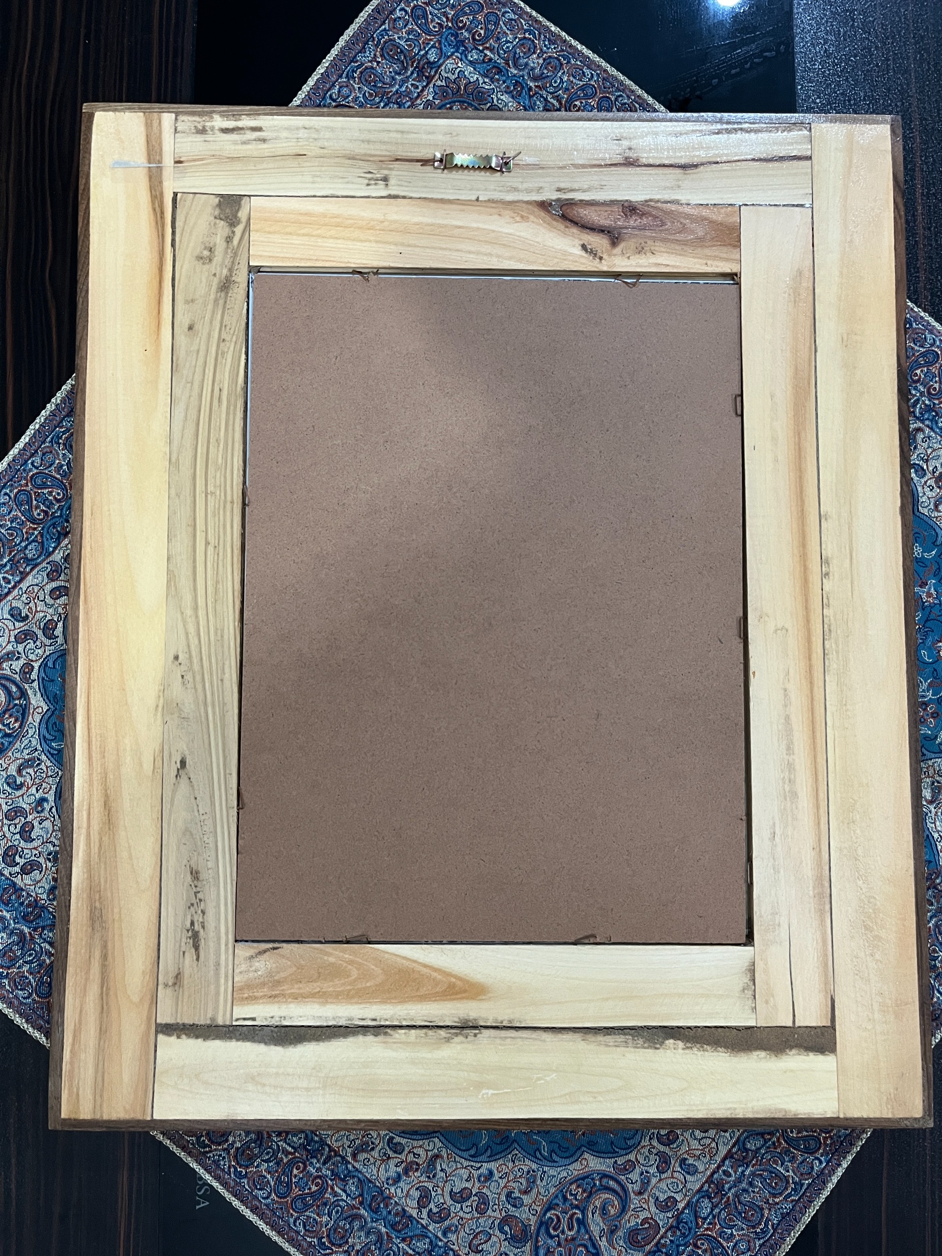 با قاب خاتم بسیار زیبا در دور. ابعاد کار از خارجی ترین نقطه قاب 50 در 60 سانت.