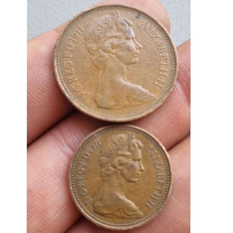 1و2 پنی جاری انگلستان ولی بسیار قدیمی ضرب سال 1971 میلادی و تصویر ملکه جوان و پنی ویکتوریا بسیار قدیمی و متعلق ب حدود 130 سال پیش ، 1896 میلادی