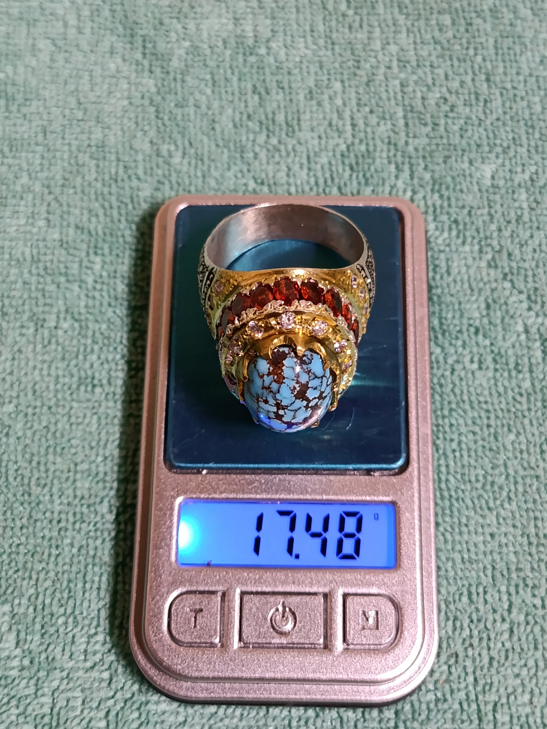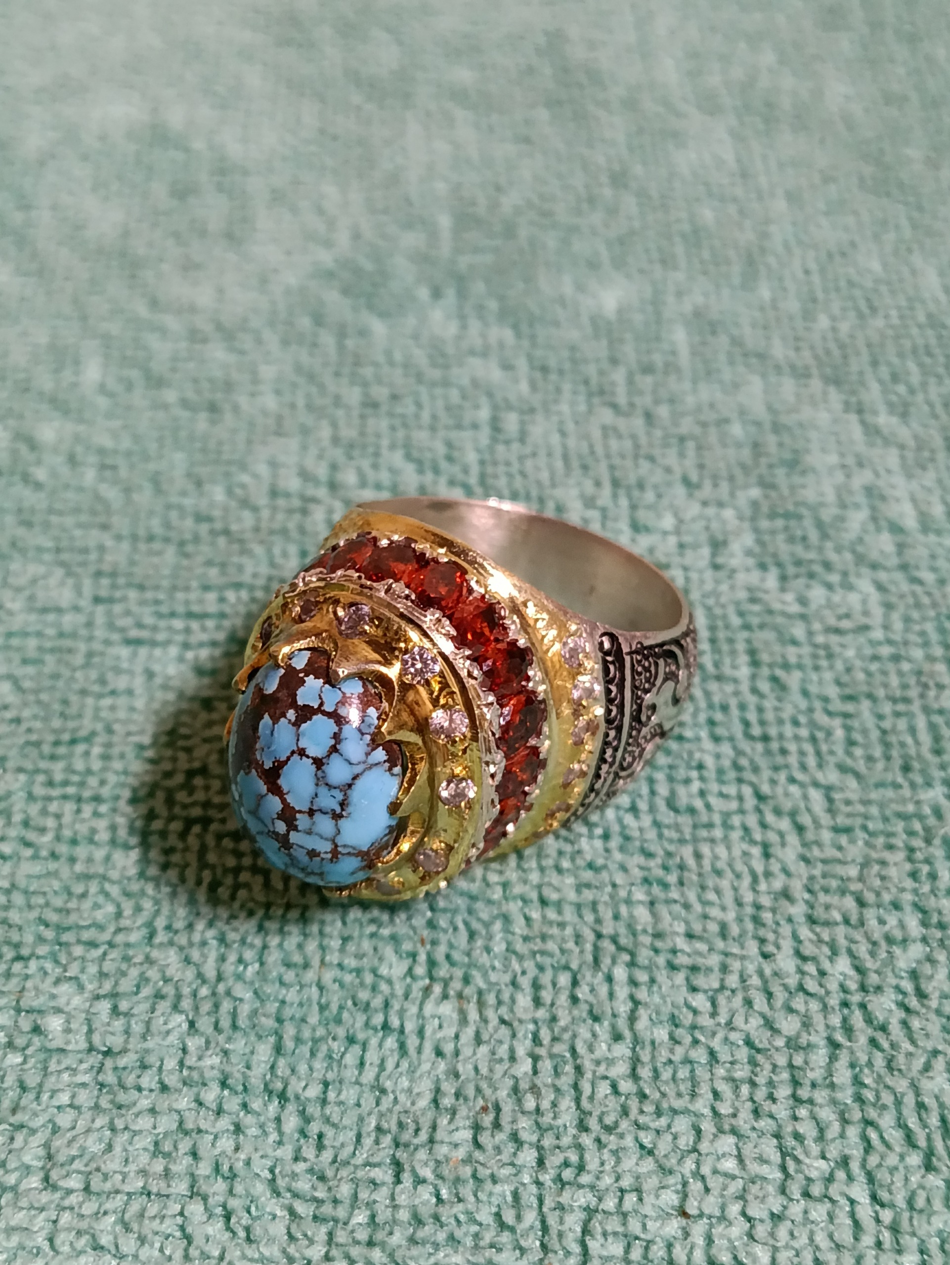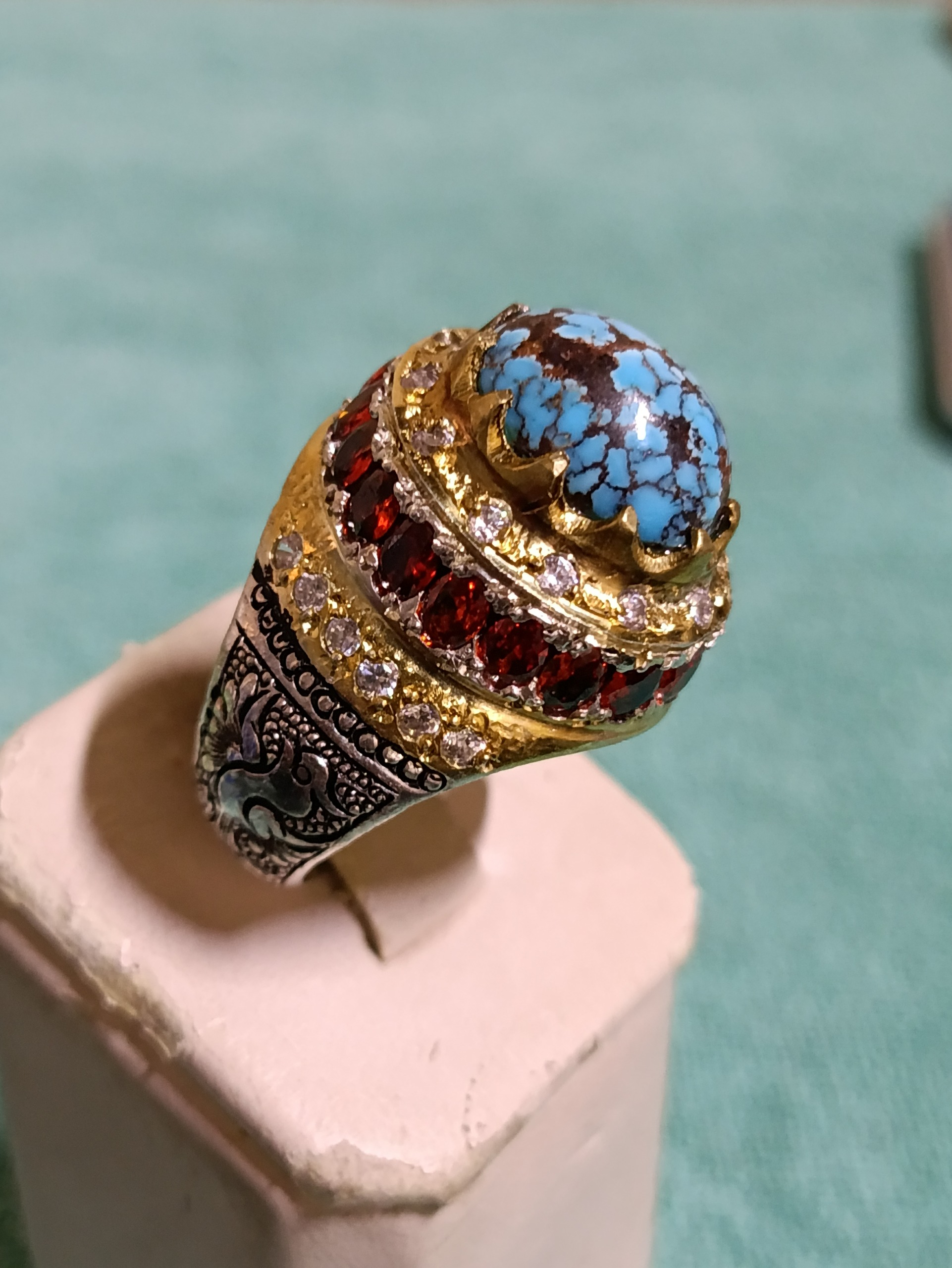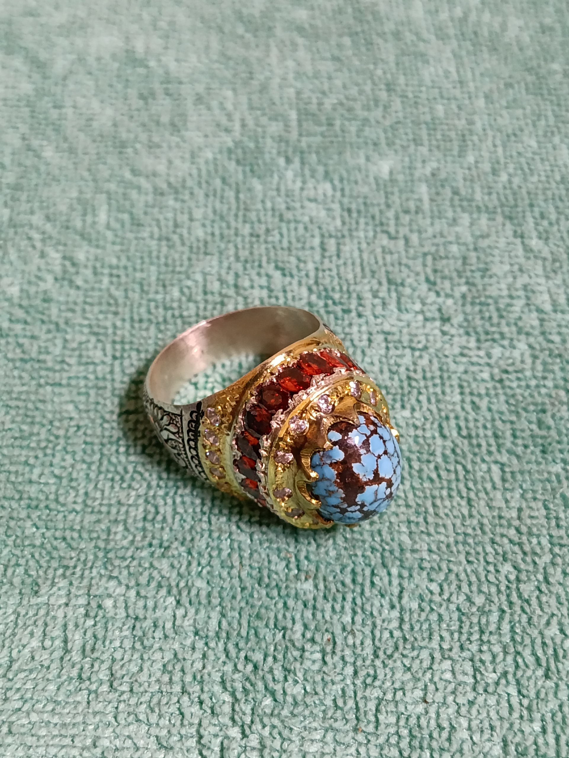 رکاب تمام نقره 925 دور نگین مخارج یاقوت و برلیان قلم کاری شده نگین سنگ فیروزه عنکبوتی سنگ سیاه معدنی