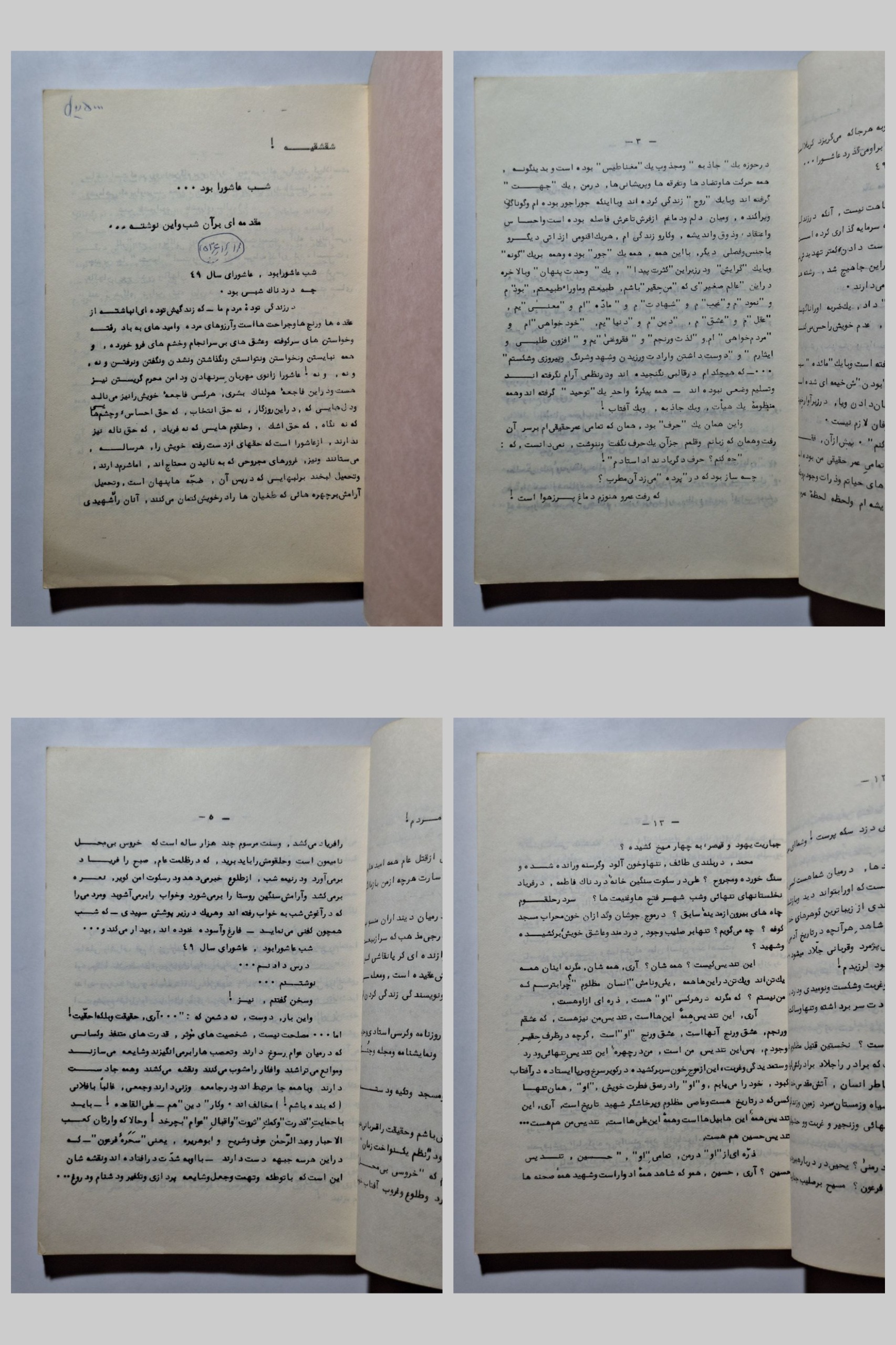 در زندگی توده مردم ما که زندگیش تودهای انباشته از عقدهها و رنجها و جراحتها است و آرزوهای مرده و امیدهای به باد رفته و خواستنهای سرکوفته و عشقهای بیسرانجام و خشمهای فروخورده و همه.....