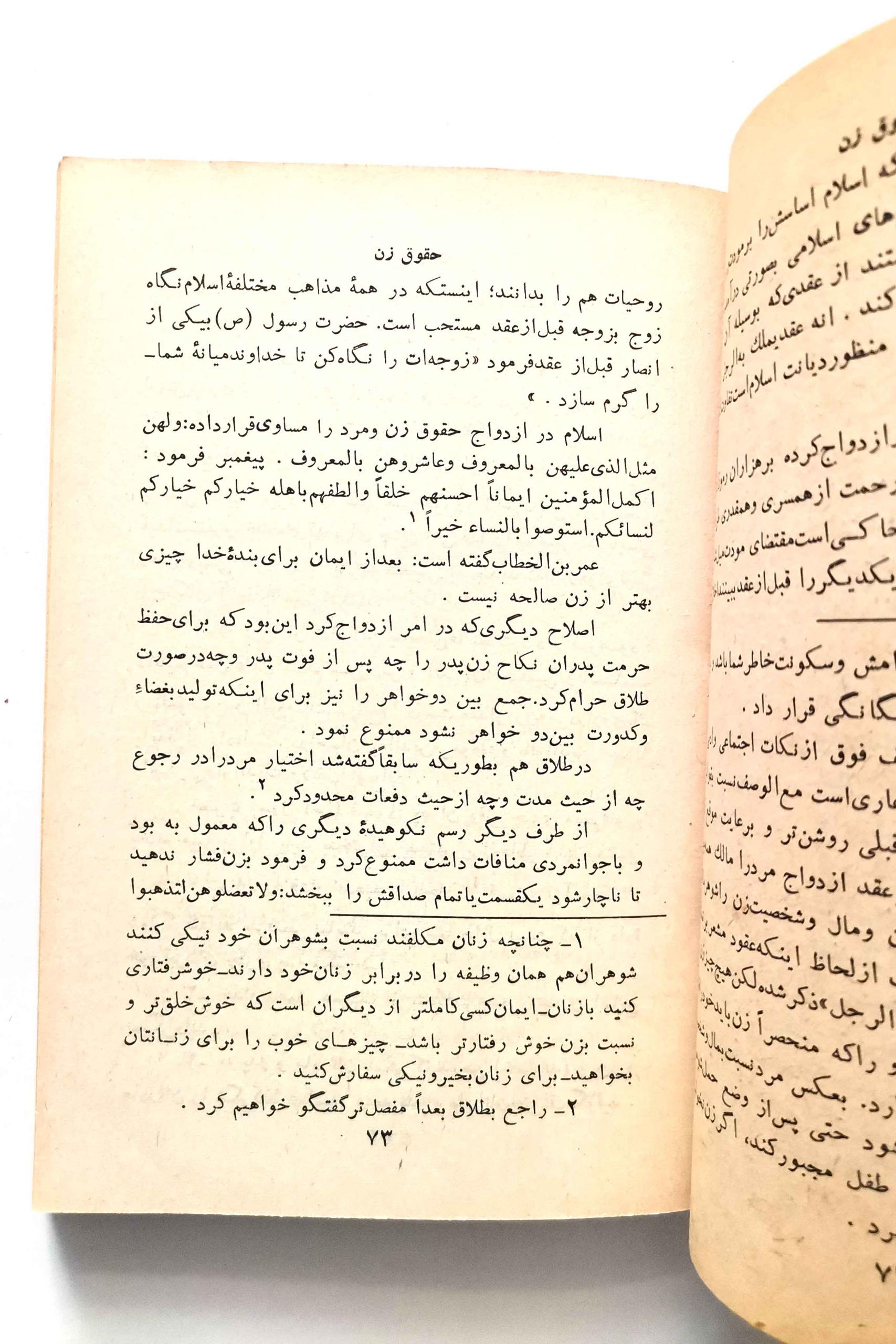 آیا اسلام مردان را برتر از زنان شمرده و حق زنان را در همه زمینه ها کمتر از مردان قرار داده است؟ آیا زنان صدر اسلام از سیاست و اجتماع برکنار بودند؟ آیا از نظر اسلام خداوند بندگان خود را به دو گروه مرد و زن تقسیم کرده که یکی بالا و دیگری پست باشد؟ و باز ناگفته نگذارم که در زنان هم مانند مردان طبیعت چنان استعدادی نهفته که زن با تربیت و تعلیم صحیح می تواند در هر کار مشکل علمی، صنعتی، اجتماعی و سیاسی که وجهه ی همت خود قرار دهد توفیق کامل یابد. ولی به طور کلی مصلحت اجتماع این است که زن و مرد هر یک همت به توفیق در وظیفه ی اختصاصی خود بگمارد.