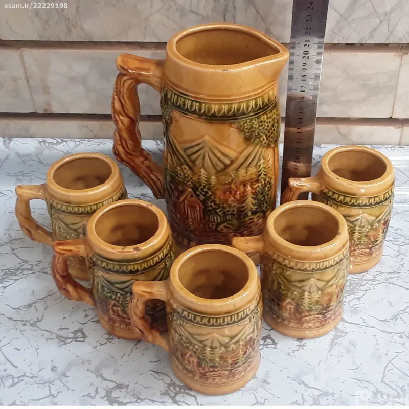 ارتفاع پارچ تقریبا 21 سانتیمتر و ارتفاع لیوان ها 10 سانتیمتر است.