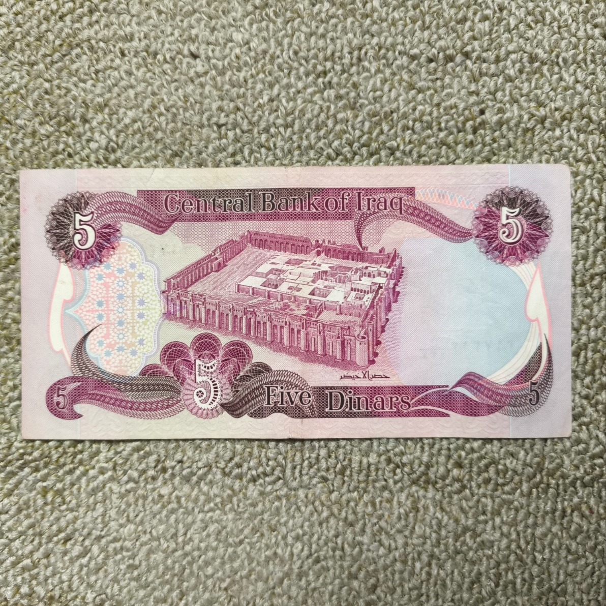 اسکناس 5 دینار عراق سال 1982 با تصویری از آبشار گلی علی بیگ در اربیل کردستان عراق در روی اسکناس و قلعه اخیضر از بناهای دوره عباسیان در جنوب غربی شهر کربلا در حدود 50 کیلومتری این شهر واقع شده است. اسکناس فقط یکی دو تای نامحسوس دارد و به شدت تمیز هست با این حال لبه ی اسکناس یک پارگی در حد سه میلیمتر دارد که لازمه مدنظر داشته باشید.