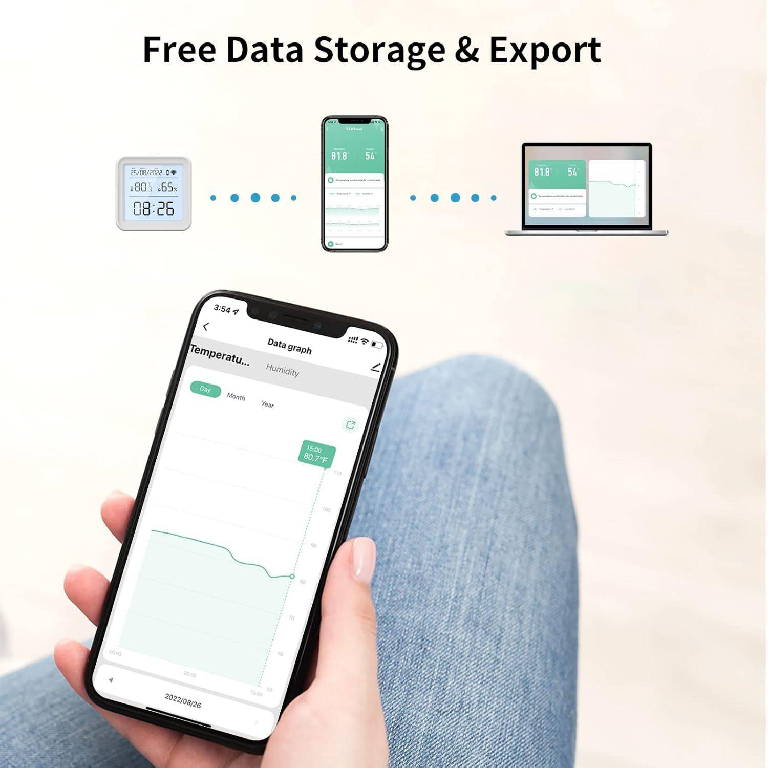 - ذخیره و صادرات رایگان داده رطوبت سنج اتاق از صادرات داده پشتیبانی می کند و ذخیره داده درون برنامه دو سال است. گزارش ها به سرعت و به راحتی با استفاده از تلفن هوشمند دانلود می شوند و سپس می توان آنها را به عنوان یک فایل CSV از طریق ایمیل صادر کرد