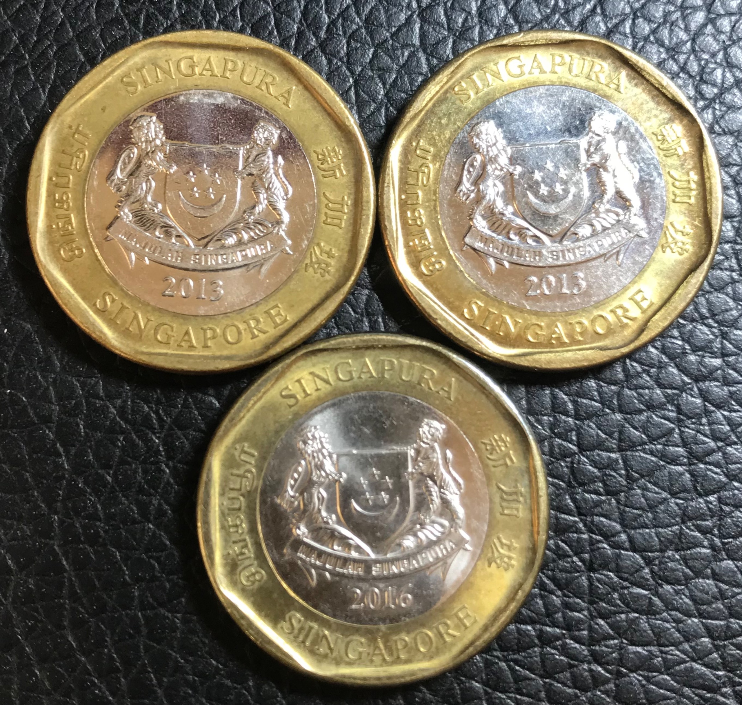 مطابق تصویر سکه های یک دلار بایمتال سنگاپور تاریخ 2013 و 2016